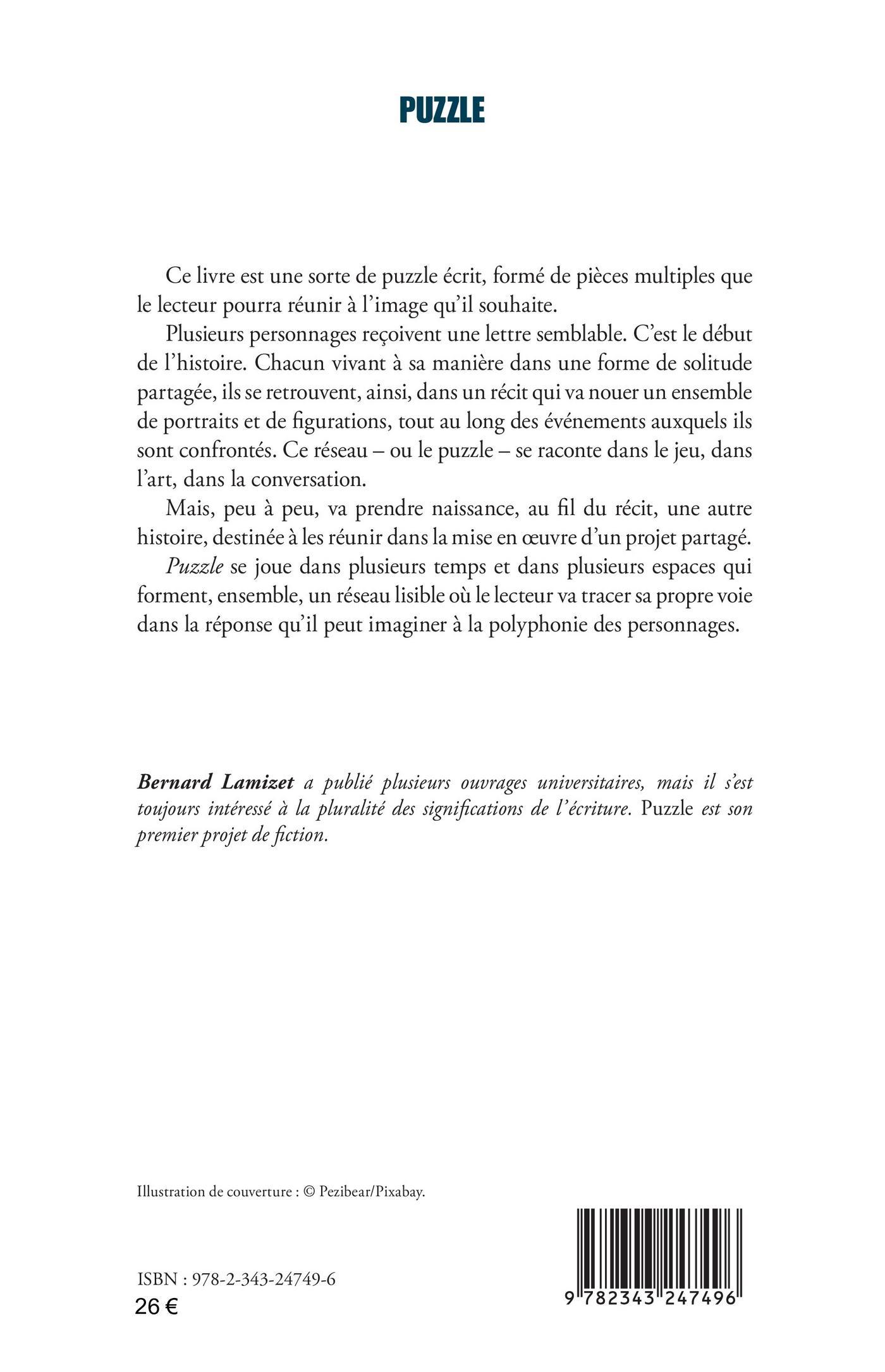 Ce livre est une sorte de puzzle écrit, formé de pièces multiples que le lecteur pourra réunir à l’image qu’il souhaite.Plusieurs personnages reçoivent une lettre semblable. C’est le début de l’histoire. Chacun vivant à sa manière dans une forme de solitude partagée, ils se retrouvent, ainsi, dans un récit qui va nouer un ensemble de portraits et de figurations, tout au long des événements auxquels ils sont confrontés. Ce réseau _ ou le puzzle _ se raconte dans le jeu, dans l’art, dans la conversation.Mais, peu à peu, va prendre naissance, au fil du récit, une autre histoire, destinée à les réunir dans la mise en oeuvre d’un projet partagé.Puzzle se joue dans plusieurs temps et dans plusieurs espaces qui forment, ensemble, un réseau lisible où le lecteur va tracer sa propre voie dans la réponse qu’il peut imaginer à la polyphonie des personnages.
