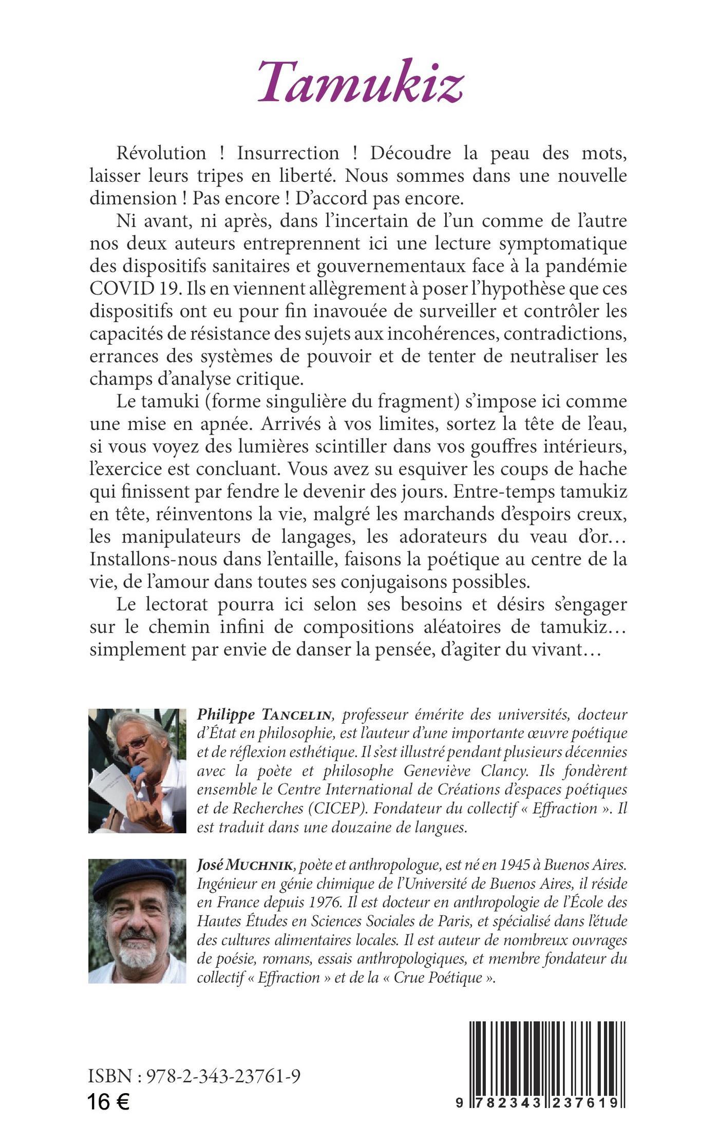 Révolution ! Insurrection ! Découdre la peau des mots, laisser leurs tripes en liberté. Nous sommes dans une nouvelle dimension ! Pas encore ! D’accord pas encore. Ni avant, ni après, dans l’incertain de l’un comme de l’autre nos deux auteurs entreprennent ici une lecture symptomatique des dispositifs sanitaires et gouvernementaux face à la pandémie COVID 19. Ils en viennent allègrement à poser l’hypothèse que ces dispositifs ont eu pour fin inavouée de surveiller et contrôler les capacités de résistance des sujets aux incohérences, contradictions, errances des systèmes de pouvoir et de tenter de neutraliser les champs d’analyse critique. Le tamuki (forme singulière du fragment) s’impose ici comme une mise en apnée. Arrivés à vos limites, sortez la tête de l’eau, si vous voyez des lumières scintiller dans vos gouffres intérieurs, l’exercice est concluant. Le lectorat pourra ici selon ses besoins et désirs s’engager sur le chemin infini de compositions aléatoires de tamukiz... simplement par envie de danser la pensée, d’agiter du vivant...
