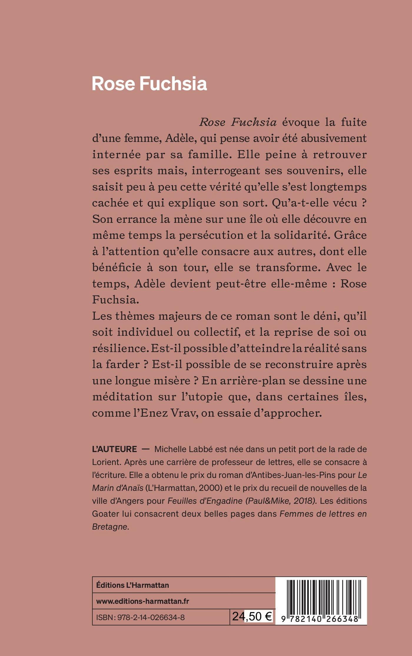 Rose Fuchsia évoque la fuite d’une femme, Adèle, qui pense avoir été abusivement internée par sa famille. Elle peine à retrouver ses esprits mais, interrogeant ses souvenirs, elle saisit peu à peu cette vérité qu’elle s’est longtemps cachée et qui explique son sort. Qu’a-t-elle vécu ? Son errance la mène sur une île où elle découvre en même temps la persécution et la solidarité. Grâce à l’attention qu’elle consacre aux autres, dont elle bénéficie à son tour, elle se transforme. Avec le temps, Adèle devient peut-être elle-même : Rose Fuchsia.Les thèmes majeurs de ce roman sont le déni, qu’il soit individuel ou collectif, et la reprise de soi ou résilience. Est-il possible d’atteindre la réalité sans la farder ? Est-il possible de se reconstruire après une longue misère ? En arrière-plan se dessine une méditation sur l’utopie que, dans certaines îles, comme l’Enez Vrav, on essaie d’approcher.