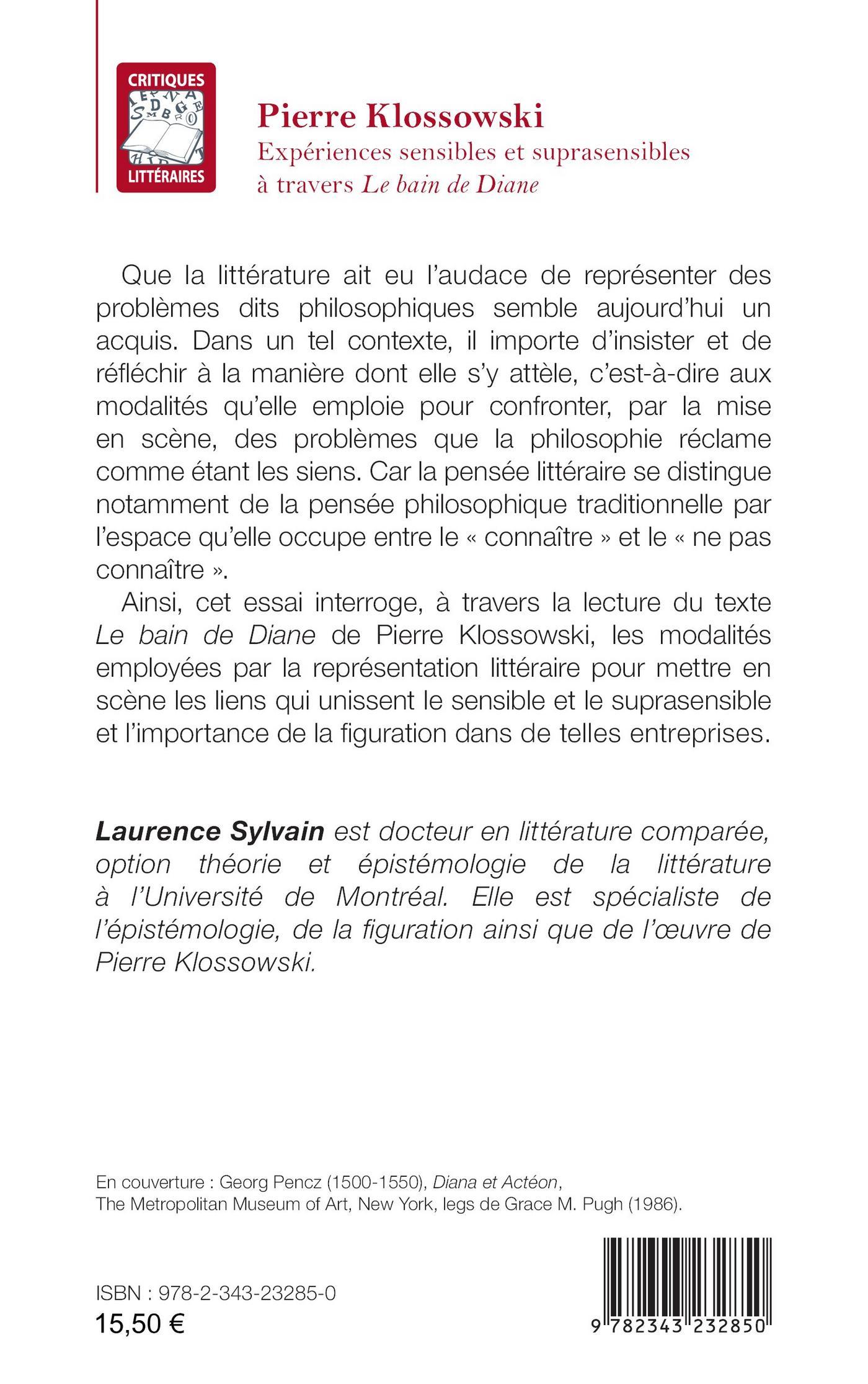 Que la littérature ait eu l’audace de représenter des problèmes dits philosophiques semble aujourd’hui un acquis. Dans un tel contexte, il importe d’insister et de réfléchir à la manière dont elle s’y attèle, c’est-à-dire aux modalités qu’elle emploie pour confronter, par la mise en scène, des problèmes que la philosophie réclame comme étant les siens. Car la pensée littéraire se distingue notamment de la pensée philosophique traditionnelle par l’espace qu’elle occupe entre le « connaître » et le « ne pas connaître ». Ainsi, cet essai interroge, à travers la lecture du texte Le bain de Diane de Pierre Klossowski, les modalités employées par la représentation littéraire pour mettre en scène les liens qui unissent le sensible et le suprasensible et l’importance de la figuration dans de telles entreprises.