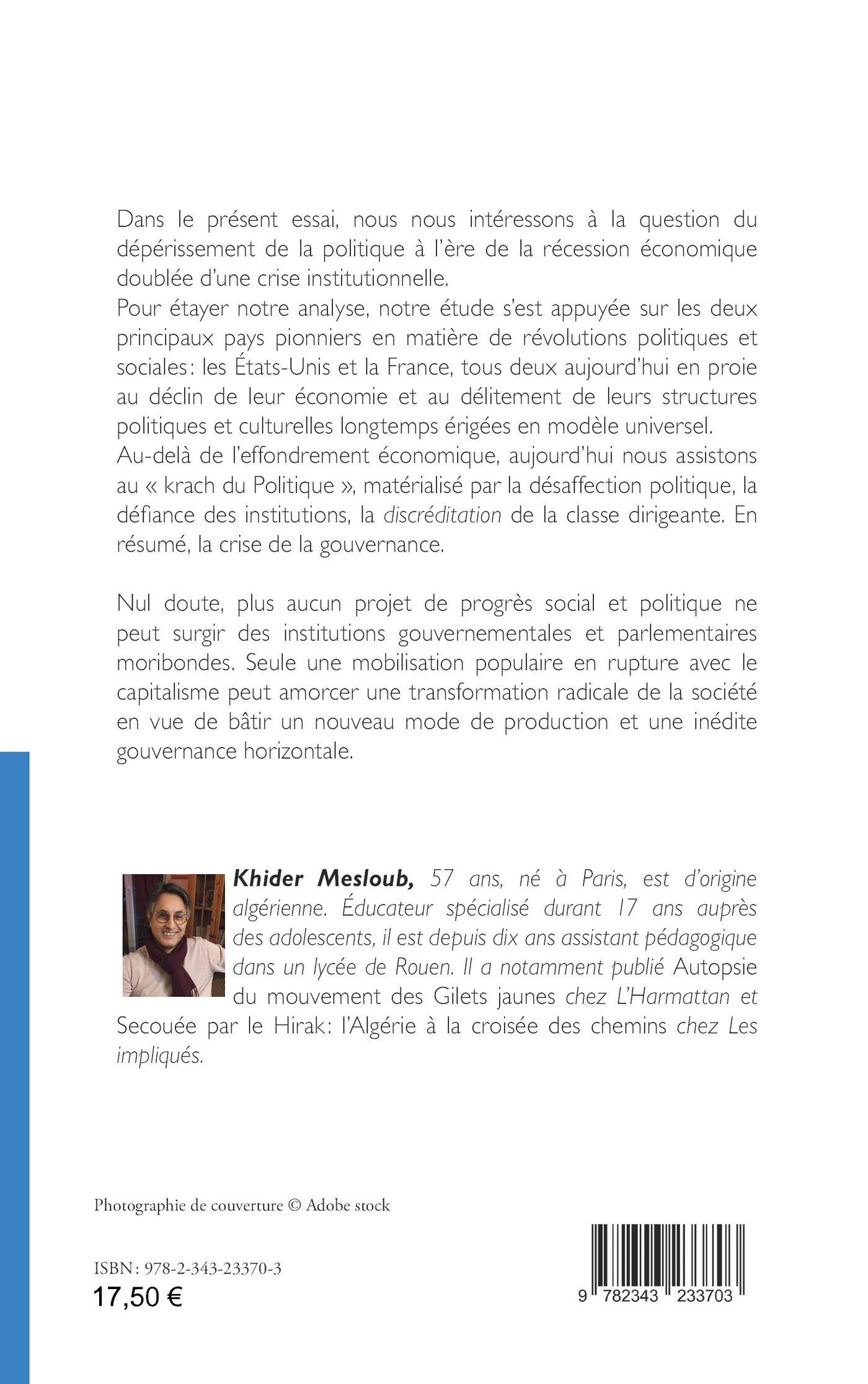 Cet ouvrage porte sur la question du dépérissement de la politique à l’ère de la récession économique doublée d’une crise institutionnelle. Pour étayer l’analyse, cette étude s’est appuyée sur les deux principaux pays pionniers en matière de révolutions politiques et sociales : les États-Unis et la France, tous deux aujourd’hui en proie au déclin de leur économie et au délitement de leurs structures politiques et culturelles longtemps érigées en modèle universel. Au-delà de l’effondrement économique, nous assistons au « krach du Politique », matérialisé par la désaffection politique, la défiance des institutions, la discréditation de la classe dirigeante. En résumé, la crise de la gouvernance. Nul doute, plus aucun projet de progrès social et politique ne peut surgir des institutions gouvernementales et parlementaires moribondes. Seule une mobilisation populaire en rupture avec le capitalisme peut amorcer une transformation radicale de la société en vue de bâtir un nouveau mode de production et une inédite gouvernance horizontale.