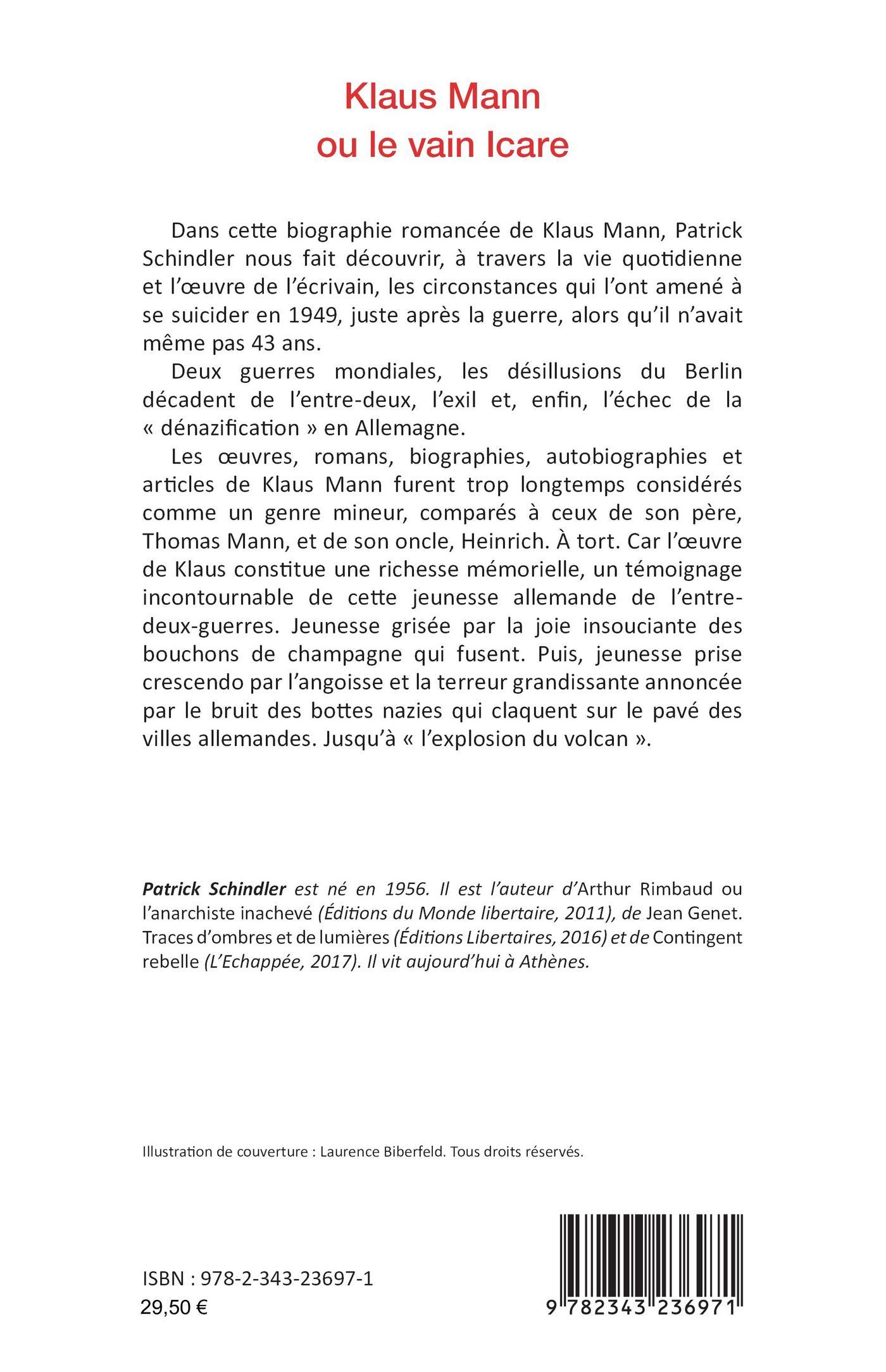 Dans cette biographie romancée de Klaus Mann, Patrick Schindler nous fait découvrir, à travers la vie quotidienne et l’œuvre de l’écrivain, les circonstances qui l’ont amené à se suicider en 1949, juste après la guerre, alors qu’il n’avait même pas 43 ans. Deux guerres mondiales, les désillusions du Berlin décadent de l’entre-deux, l’exil et, enfin, l’échec de la « dénazification » en Allemagne. Les oeuvres, romans, biographies, autobiographies et articles de Klaus Mann furent trop longtemps considérés comme un genre mineur, comparés à ceux de son père, Thomas Mann, et de son oncle, Heinrich. À tort. Car l’oeuvre de Klaus constitue une richesse mémorielle, un témoignage incontournable de cette jeunesse allemande de l’entre-deux-guerres. Jeunesse grisée par la joie insouciante des bouchons de champagne qui fusent. Puis, jeunesse prise crescendo par l’angoisse et la terreur grandissante annoncée par le bruit des bottes nazies qui claquent sur le pavé des villes allemandes. Jusqu’à « l’explosion du volcan ».