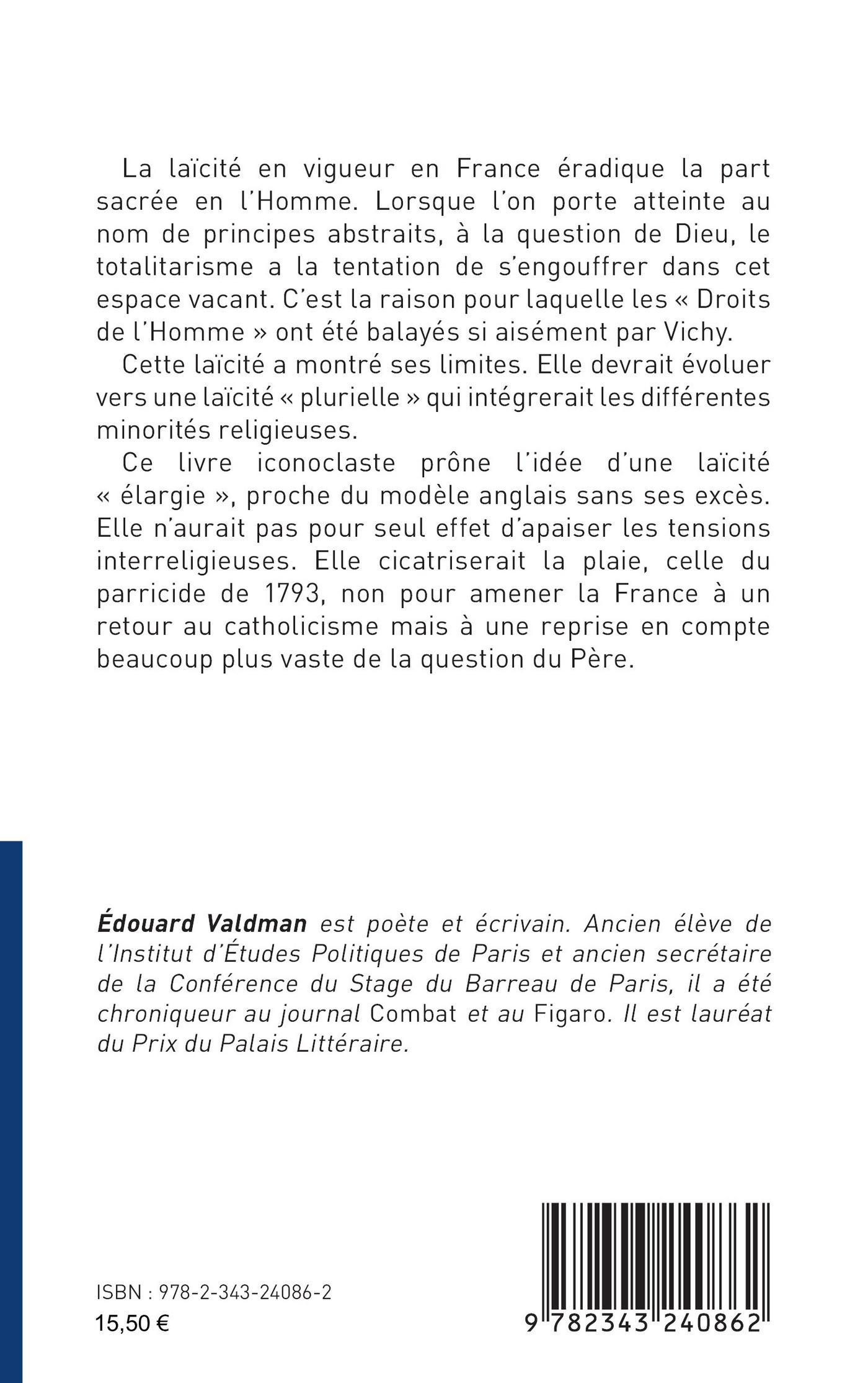 La laïcité en vigueur en France éradique la part sacrée en l’Homme. Lorsque l’on porte atteinte au nom de principes abstraits, à la question de Dieu, le totalitarisme a la tentation de s’engouffrer dans cet espace vacant. C’est la raison pour laquelle les « Droits de l’Homme » ont été balayés si aisément par Vichy. Cette laïcité a montré ses limites. Elle devrait évoluer vers une laïcité « plurielle » qui intégrerait les différentes minorités religieuses. Cet ouvrage iconoclaste prône l’idée d’une laïcité « élargie », proche du modèle anglais sans ses excès. Elle n’aurait pas pour seul effet d’apaiser les tensions interreligieuses. Elle cicatriserait la plaie, celle du parricide de 1793, non pour amener la France à un retour au catholicisme mais à une reprise en compte beaucoup plus vaste de la question du Père.