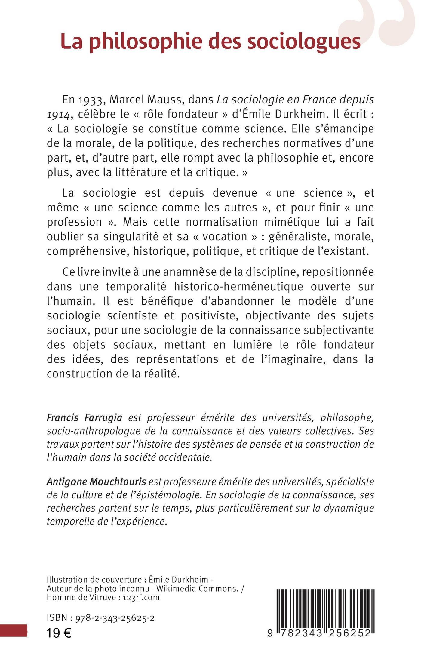 En 1933, Marcel Mauss, dans La sociologie en France depuis 1914, célèbre le « rôle fondateur » d’Émile Durkheim. Il écrit : « La sociologie se constitue comme science. Elle s’émancipe de la morale, de la politique, des recherches normatives d’une part, et, d’autre part, elle rompt avec la philosophie et, encore plus, avec la littérature et la critique. » La sociologie est depuis devenue « une science », et même « une science comme les autres », et pour finir « une profession ». Mais cette normalisation mimétique lui a fait oublier sa singularité et sa « vocation » : généraliste, morale, compréhensive, historique, politique, et critique de l’existant. Ce livre invite à une anamnèse de la discipline, repositionnée dans une temporalité historico-herméneutique ouverte sur l’humain. Il est bénéfique d’abandonner le modèle d’une sociologie scientiste et positiviste, objectivante des sujets sociaux, pour une sociologie de la connaissance subjectivante des objets sociaux, mettant en lumière le rôle fondateur des idées, des représentations et de l’imaginaire, dans la construction de la réalité.