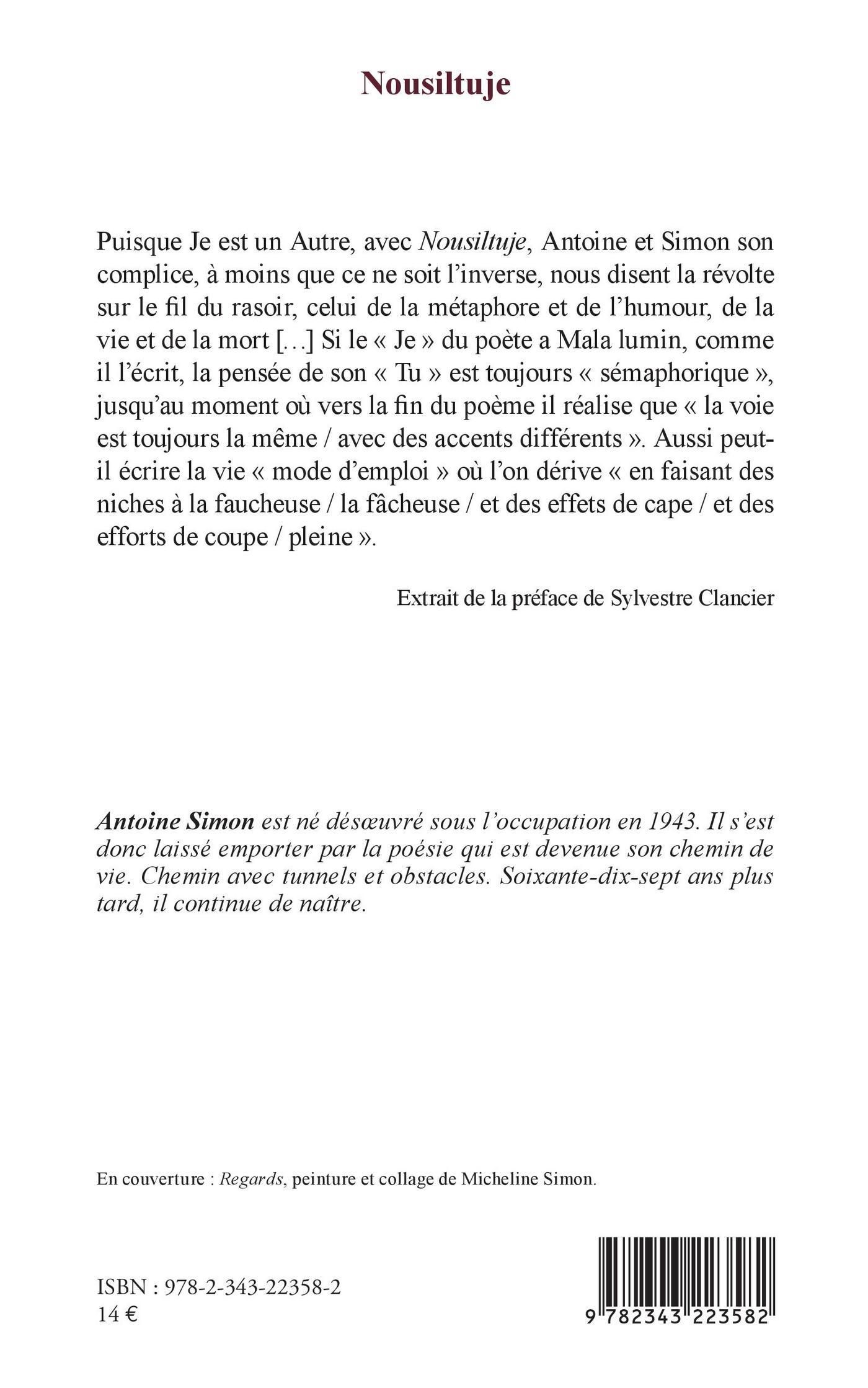 Puisque Je est un Autre, avec Nousiltuje, Antoine et Simon son complice, à moins que ce ne soit l'inverse, nous disent la révolte sur le fil du rasoir, celui de la métaphore et de l'humour, de la vie et de la mort [...] Si le « Je » du poète a Mala lumin, comme il l'écrit, la pensée de son « Tu » est toujours « sémaphorique », jusqu'au moment où vers la fin du poème il réalise que « la voie est toujours la même / avec des accents différents ». Aussi peut-il écrire la vie « mode d'emploi » où l'on dérive « en faisant des niches à la faucheuse / la fâcheuse / et des effets de cape / et des efforts de coupe / pleine ».Sylvestre Clancier