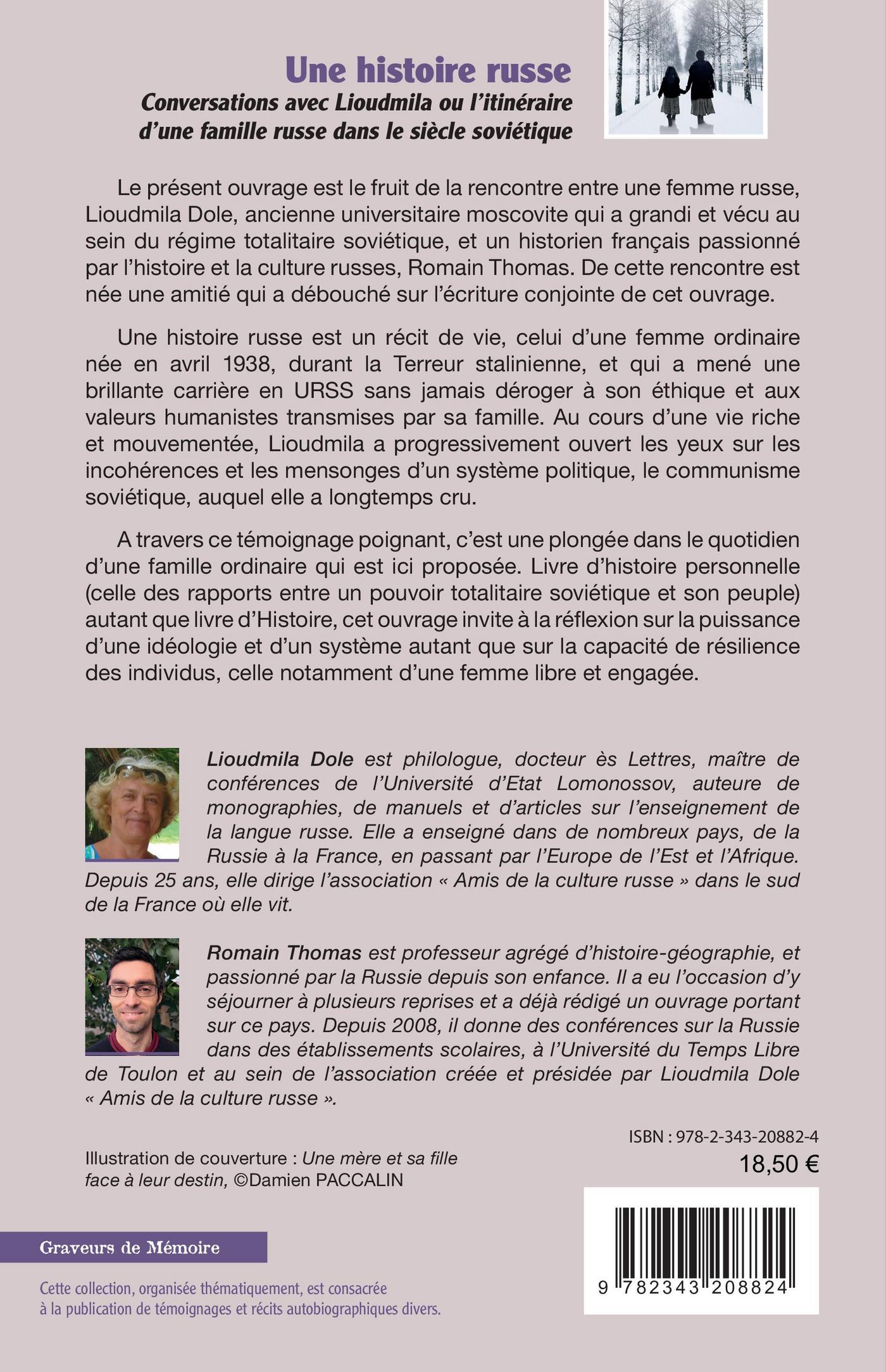 Le présent ouvrage est le fruit de la rencontre entre une femme russe, Lioudmila Dole, et un historien français passionné par l’histoire et la culture russes, Romain Thomas. De cette rencontre est née une amitié qui a débouché sur l’écriture conjointe de cet ouvrage. Une histoire russe est un récit de vie, celui d’une femme ordinaire née en avril 1938, durant la Terreur stalinienne, et qui a mené une brillante carrière en URSS sans jamais déroger à son éthique et aux valeurs humanistes transmises par sa famille. Au cours d’une vie riche et mouvementée, Lioudmila a progressivement ouvert les yeux sur les incohérences et les mensonges d’un système politique, le communisme soviétique, auquel elle a longtemps cru. A travers ce témoignage poignant, c’est une plongée dans le quotidien d’une famille ordinaire qui est ici proposée.