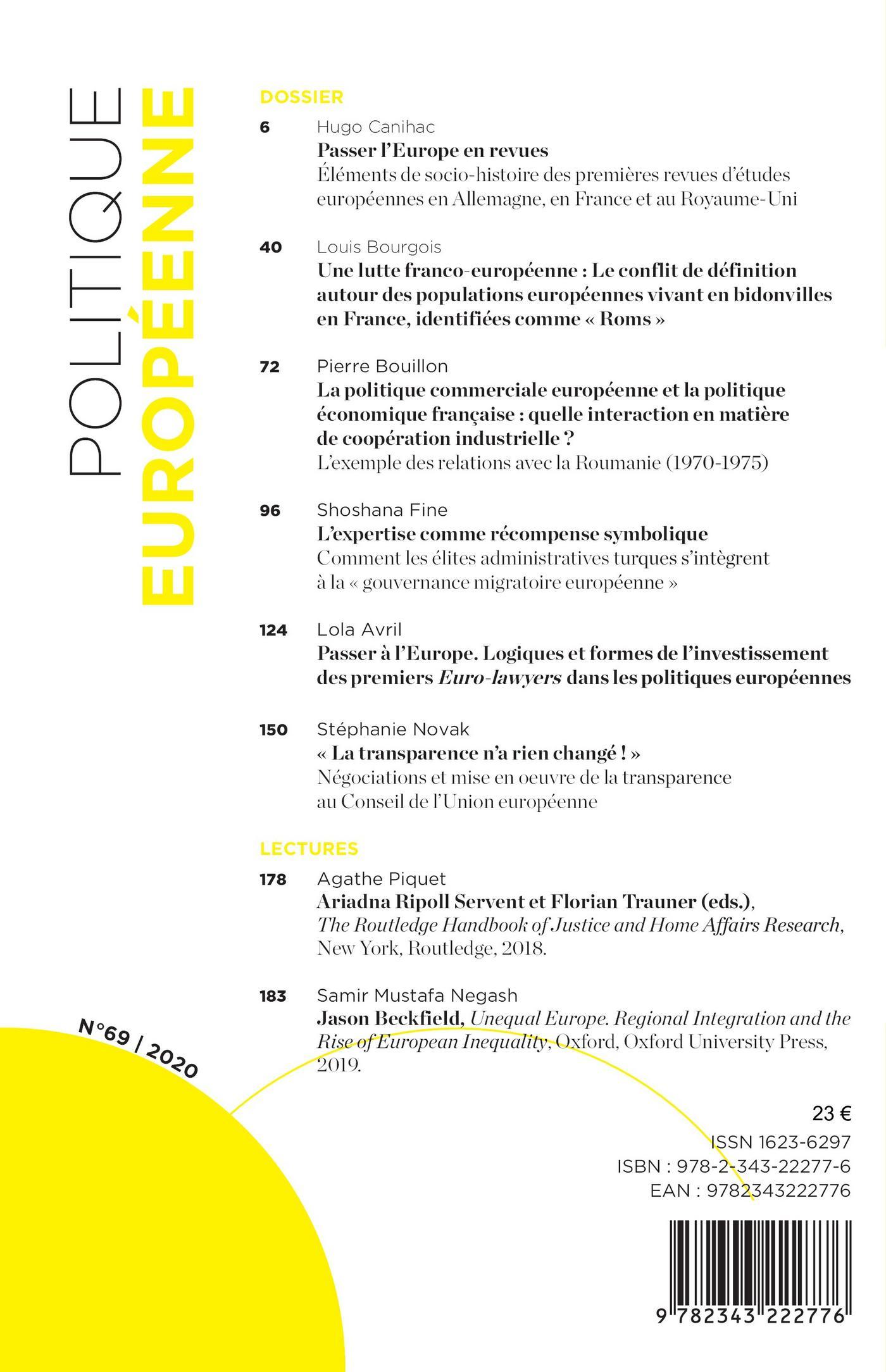 Au sommaire du numéro 69 : Passer l’Europe en revue / Une lutte franco-européenne : Le conflit de définition autour des populations européennes vivant en bidonvilles en France, identifiées comme « Roms » / La politique commerciale européenne et la politique économique française : quelle interaction en matière de coopération industrielle ? / L’expertise comme récompense symbolique / Passer à l’Europe. Logiques et formes de l’investissement des premiers Euro-lawyers dans les politiques européennes / « La transparence n’a rien changé ! »