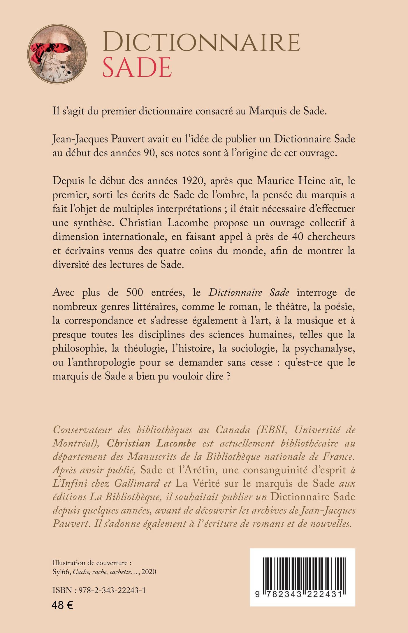 Il s’agit du premier dictionnaire consacré au Marquis de Sade. Depuis le début des années 1920, après que Maurice Heine ait, le premier, sorti les écrits de Sade de l’ombre, la pensée du marquis a fait l’objet de multiples interprétations ; il était nécessaire d’effectuer une synthèse. Christian Lacombe propose un ouvrage collectif à dimension internationale, en faisant appel à près de 40 chercheurs et écrivains venus des quatre coins du monde, afin de montrer la diversité des lectures de Sade. Avec plus de 500 entrées, le Dictionnaire Sade interroge de nombreux genres littéraires, comme le roman, le théâtre, la poésie, la correspondance et s’adresse également à l’art, à la musique et à presque toutes les disciplines des sciences humaines, pour se demander sans cesse : qu’est-ce que le marquis de Sade a bien pu vouloir dire ?