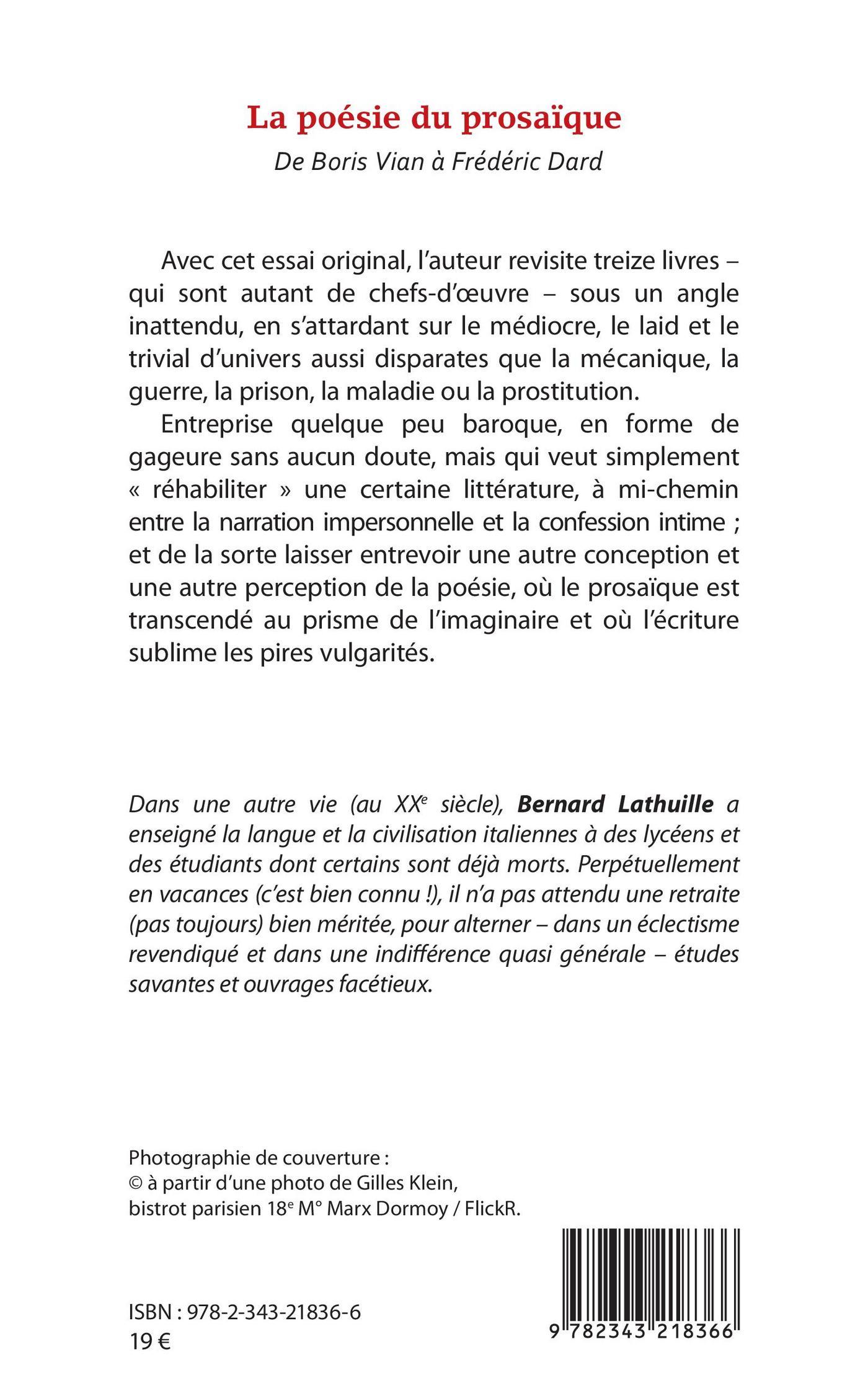 Avec cet essai original, l'auteur revisite treize livres - qui sont autant de chefs-d'oeuvre - sous un angle inattendu, en s'attardant sur le médiocre, le laid et le trivial d'univers aussi disparates que la mécanique, la guerre, la prison, la maladie ou la prostitution. Entreprise quelque peu baroque, en forme de gageure sans aucun doute, mais qui veut simplement « réhabiliter » une certaine littérature, à mi-chemin entre la narration impersonnelle et la confession intime ; et de la sorte laisser entrevoir une autre conception et une autre perception de la poésie, où le prosaïque est transcendé au prisme de l'imaginaire et où l'écriture sublime les pires vulgarités.