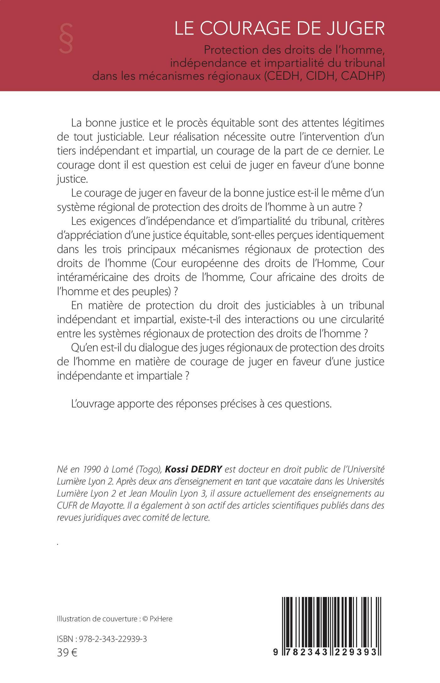 La bonne justice et le procès équitable sont des attentes légitimes de tout justiciable. Leur réalisation nécessite outre l'intervention d'un tiers indépendant et impartial, un courage de la part de ce dernier. Le courage dont il est question est celui de juger en faveur d'une bonne justice. Mais ce courage est-il le même d'un système régional de protection des droits de l'homme à un autre ? Les exigences d'indépendance et d'impartialité du tribunal, critères d'appréciation d'une justice équitable, sont-elles perçues identiquement dans les trois principaux mécanismes régionaux de protection des droits de l'homme (Cour européenne, Cour intéraméricaine et Cour africaine des droits de l'homme et des peuples) ? Existe-t-il des interactions ou une circularité entre les systèmes régionaux de protection des droits de l'homme ? Qu'en est-il du dialogue des juges régionaux en matière de courage de juger en faveur d'une justice indépendante et impartiale ?