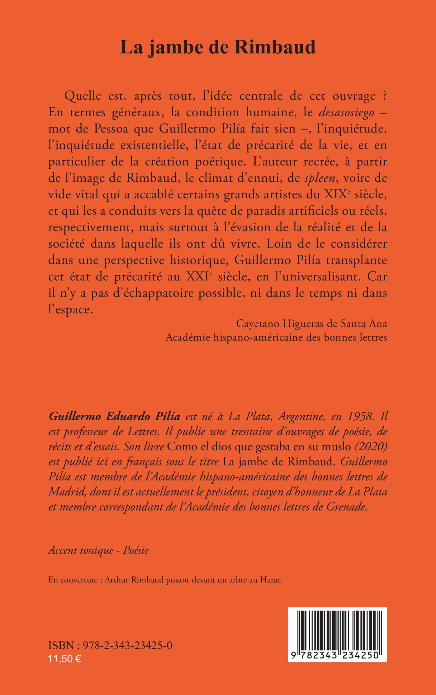 Quelle est, après tout, l’idée centrale de cet ouvrage ? En termes généraux, la condition humaine, le desasosiego – mot de Pessoa que Guillermo Pilía fait sien –, l’inquiétude, l’inquiétude existentielle, l’état de précarité de la vie, et en particulier de la création poétique. L’auteur recrée, à partir de l’image de Rimbaud, le climat d’ennui, de spleen, voire de vide vital qui a accablé certains grands artistes du XIXe siècle, et qui les a conduits vers la quête de paradis artificiels ou réels, respectivement, mais surtout à l’évasion de la réalité et de la société dans laquelle ils ont dû vivre. Loin de le considérer dans une perspective historique, Guillermo Pilía transplante cet état de précarité au XXIe siècle, en l’universalisant. Car il n’y a pas d’échappatoire possible, ni dans le temps ni dans l’espace.