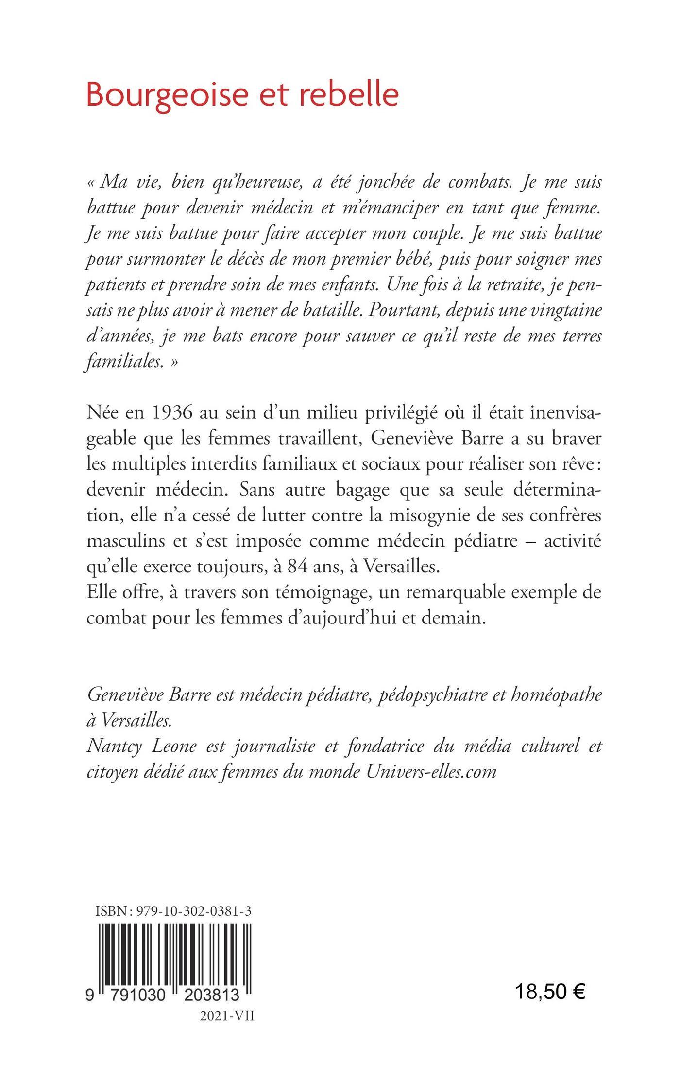 « Ma vie, bien qu’heureuse, a été jonchée de combats. Je me suis battue pour devenir médecin et m’émanciper en tant que femme. Je me suis battue pour faire accepter mon couple. Je me suis battue pour surmonter le décès de mon premier bébé, puis pour soigner mes patients et prendre soin de mes enfants. Une fois à la retraite, je pensais ne plus avoir à mener de bataille. Pourtant, depuis une vingtaine d’années, je me bats encore pour sauver ce qu’il reste de mes terres familiales. »Née en 1936 au sein d’un milieu privilégié où il était inenvisageable que les femmes travaillent, Geneviève Barre a su braver les multiples interdits familiaux et sociaux pour réaliser son rêve : devenir médecin. Sans autre bagage que sa seule détermination, elle n’a cessé de lutter contre la misogynie de ses confrères masculins et s’est imposée comme médecin pédiatre – activité qu’elle exerce toujours, à 84 ans, à Versailles.Elle offre, à travers son témoignage, un remarquable exemple de combat pour les femmes d’aujourd’hui et demain.