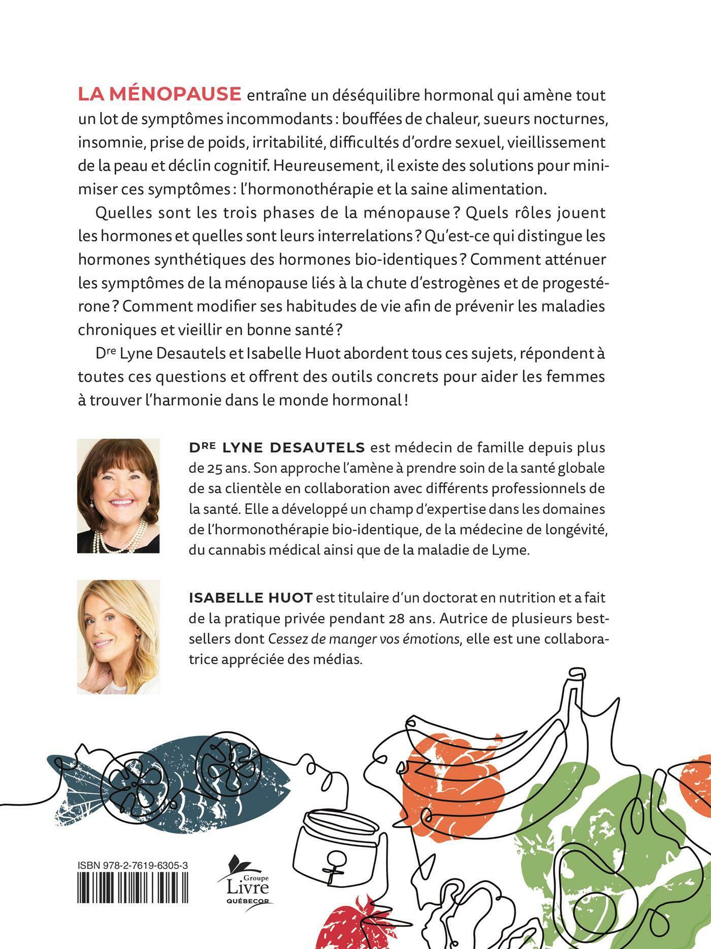 Quelles sont les trois phases de la ménopause? Quels rôles jouent les hormones et quelles sont leurs interrelations? Qu'est-ce qui distingue les hormones synthétiques des hormones bio-identiques? Comment atténuer les symptômes de la ménopause liés à la chute d'estrogènes et de progestérone? Comment modifier ses habitudes de vie afin de prévenir les maladies chroniques et vieillir en bonne santé? Dre Lyne Desautels et Isabelle Huot abordent tous ces sujets, répondent à toutes ces questions et offrent des outils concrets pour aider les femmes à trouver l'harmonie dans le monde hormonal!