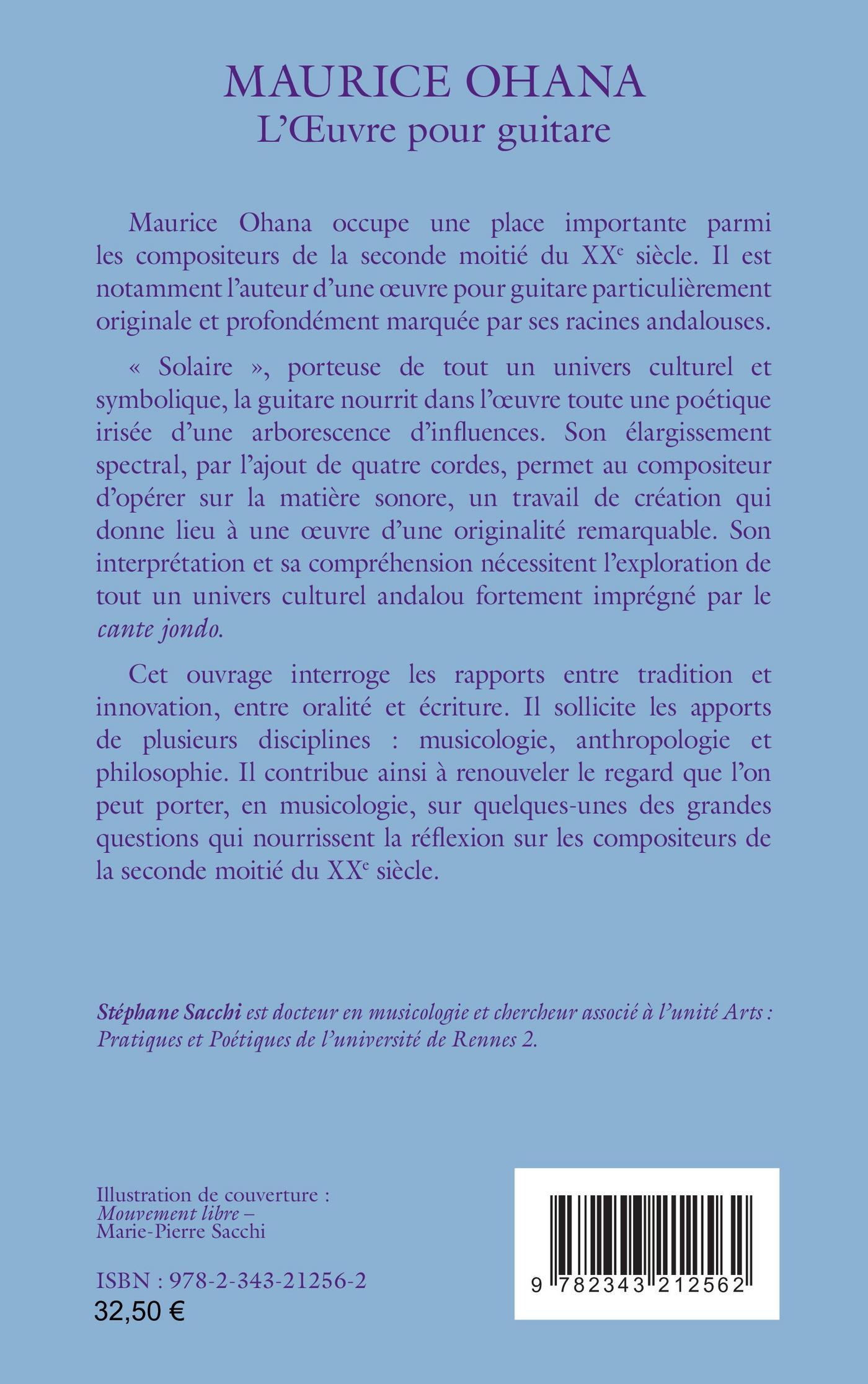 Maurice Ohana occupe une place importante parmi les compositeurs de la seconde moitié du XXe siècle. Il est notamment l’auteur d’une oeuvre pour guitare particulièrement originale et profondément marquée par tout un univers culturel andalou fortement imprégné par le cante jondo. L'élargissement spectral de l'instrument, par l’ajout de quatre cordes, permet au compositeur d’opérer sur la matière sonore, un travail de création qui donne lieu à une oeuvre d’une originalité remarquable. Cet ouvrage interroge les rapports entre tradition et innovation, entre oralité et écriture. Il sollicite les apports de plusieurs disciplines : musicologie, anthropologie et philosophie. Il contribue ainsi à renouveler le regard que l’on peut porter, en musicologie, sur quelques-unes des grandes questions qui nourrissent la réflexion sur les compositeurs de la seconde moitié du XXe siècle.