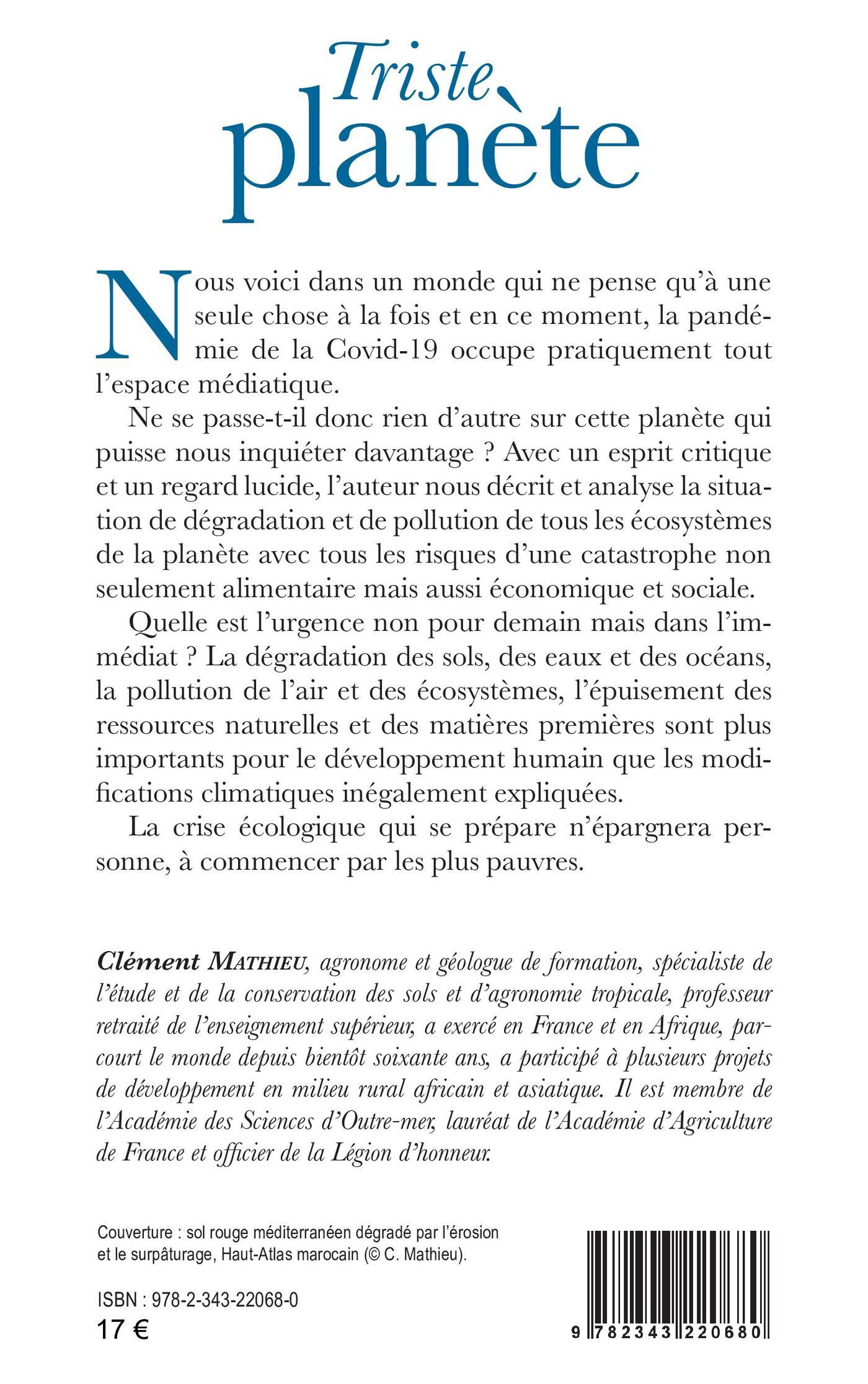 Le monde ne pense qu’à une seule chose à la fois et en ce moment, la Covid-19 occupe tout l’espace médiatique. Ne se passe-t-il donc rien d’autre de plus inquiétant sur cette planète ? Avec un esprit critique et un regard lucide, l’auteur nous décrit et analyse la situation de dégradation et de pollution de tous les écosystèmes de la planète avec les risques d’une catastrophe alimentaire mais aussi économique et sociale. Quelle est l’urgence non pour demain mais dans l’immédiat ? La dégradation des sols, des eaux et des océans, la pollution de l’air et des écosystèmes, l’épuisement des ressources sont plus importants pour le développement humain que les modifications climatiques. La crise écologique qui se prépare n’épargnera personne, à commencer par les plus pauvres.