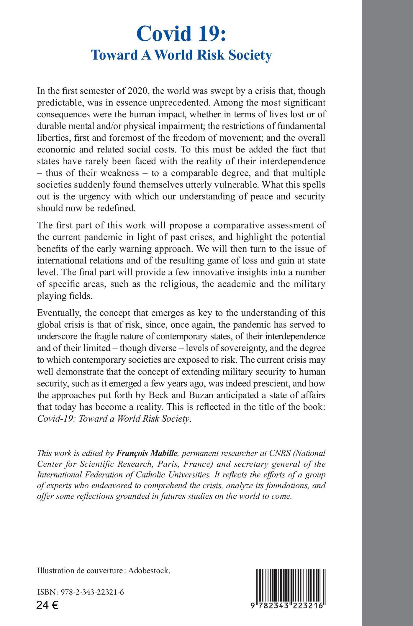 In 2020, the world was swept by a crisis that, though predictable, was in essence unprecedented. Among the most significant consequences were the human impact, whether in terms of lives lost or of durable mental and/or physical impairment; the restrictions of fundamental liberties ; and the overall economic and related social costs. Moreover, states have rarely been faced with the reality of their interdependence to a comparable degree : multiple societies suddenly found themselves utterly vulnerable. Our understanding of peace and security should now be redefined. The first part of this work will propose a comparative assessment of the current pandemic in light of past crises, and highlight the potential benefits of the early warning approach. We will then turn to the issue of international relations and of the resulting game of loss and gain at state level. The final part will provide a few innovative insights into a number of specific areas, such as the religious, the academic and the military playing fields. The concept that emerges is that of risk.