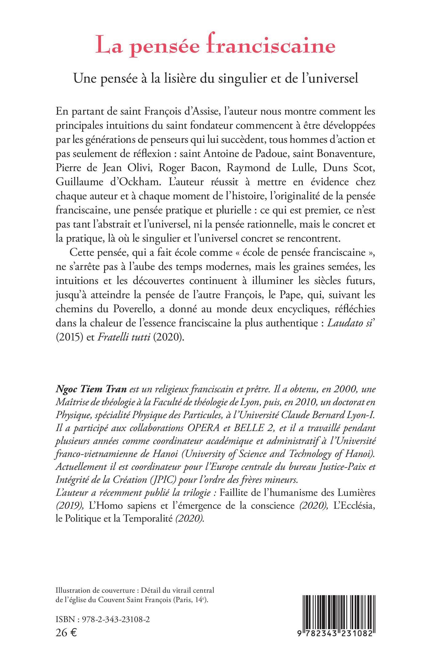 Partant de saint François d'Assise, l'auteur nous montre comment les principales intuitions du saint fondateur commencent à être développées par les générations de penseurs qui lui succèdent, tous hommes d'action et pas seulement de réflexion : saint Antoine de Padoue, saint Bonaventure, Pierre de Jean Olivi, Roger Bacon, Raymond de Lulle, Duns Scot, Guillaume d'Ockham. La pensée franciscaine est une pensée pratique et plurielle : ce qui est premier, ce n'est pas tant l'abstrait et l'universel, ni la pensée rationnelle, mais le concret et la pratique, là où le singulier et l'universel concret se rencontrent. Cette pensée, qui a fait école, ne s'arrête pas à l'aube des temps modernes, mais les graines semées, les intuitions et les découvertes continuent à illuminer les siècles futurs, jusqu'à atteindre la pensée de l'autre François, le Pape, qui, suivant les chemins du Poverello, a donné au monde deux encycliques.