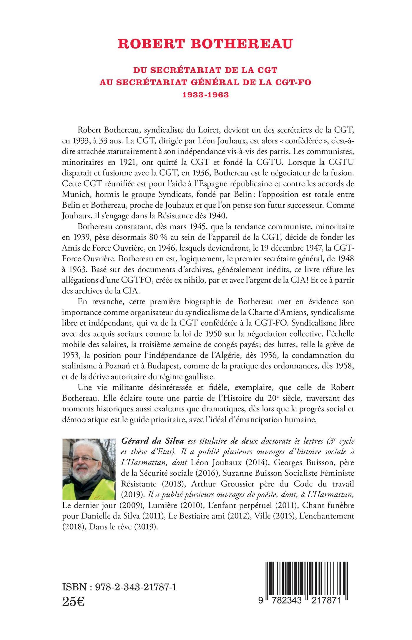 Robert Bothereau, syndicaliste du Loiret, devient un des secrétaires de la CGT en 1933, à 33 ans. La CGT, dirigée par Léon Jouhaux, est alors « confédérée », c'est-à-dire indépendante vis-à-vis des partis. Les communistes, minoritaires, ont quitté la CGT et fondé la CGTU. Lorsqu'elle fusionne avec la CGT, en 1936, Bothereau est le négociateur de la fusion. Cette CGT réunifiée est pour l'aide à l'Espagne républicaine et contre les accords de Munich. Bothereau s'engage dans la Resistance dès 1940. Constatant en 1945 que la tendance communiste pèse désormais 80 % au sein de la CGT, il décide de fonder les Amis de Force Ouvrière, qui deviendront la CGT-Force Ouvrière. Bothereau en est le premier secrétaire général (1948-1963). Basé sur des documents d'archives, généralement inédits, cet ouvrage réfute les allégations d'une CGT-FO créée par et avec l'argent de la CIA. Cette première biographie de Bothereau met en évidence son importance comme organisateur du syndicalisme de la Charte d'Amiens : un syndicalisme libre. Militante, désintéressée et fidèle, cette vie exemplaire éclaire l'Histoire du XXe siècle.