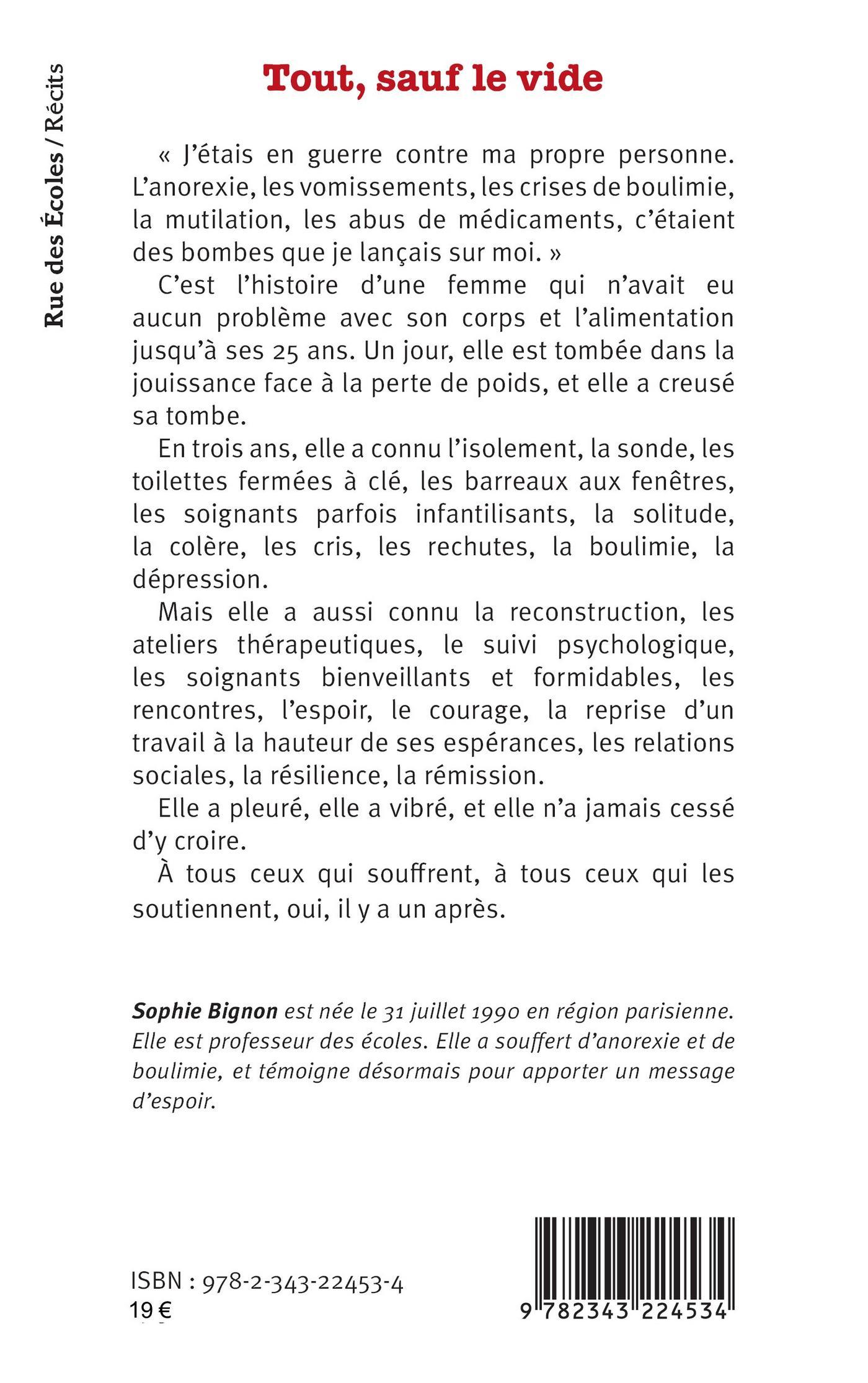« J’étais en guerre contre ma propre personne. L’anorexie, les vomissements, les crises de boulimie, la mutilation, les abus de médicaments, c’étaient des bombes que je lançais sur moi. » C’est l’histoire d’une femme qui n’avait eu aucun problème avec son corps et l’alimentation jusqu’à ses 25 ans. Un jour, elle est tombée dans la jouissance face à la perte de poids, et elle a creusé sa tombe. En trois ans, elle a connu l’isolement, la sonde, les toilettes fermées à clé, les barreaux aux fenêtres, les soignants parfois infantilisants, la solitude, la colère, les cris, les rechutes, la boulimie, la dépression. Mais elle a aussi connu la reconstruction, les ateliers thérapeutiques, le suivi psychologique, les soignants bienveillants et formidables, les rencontres, l’espoir, le courage, la reprise d’un travail à la hauteur de ses espérances, les relations sociales, la résilience, la rémission.