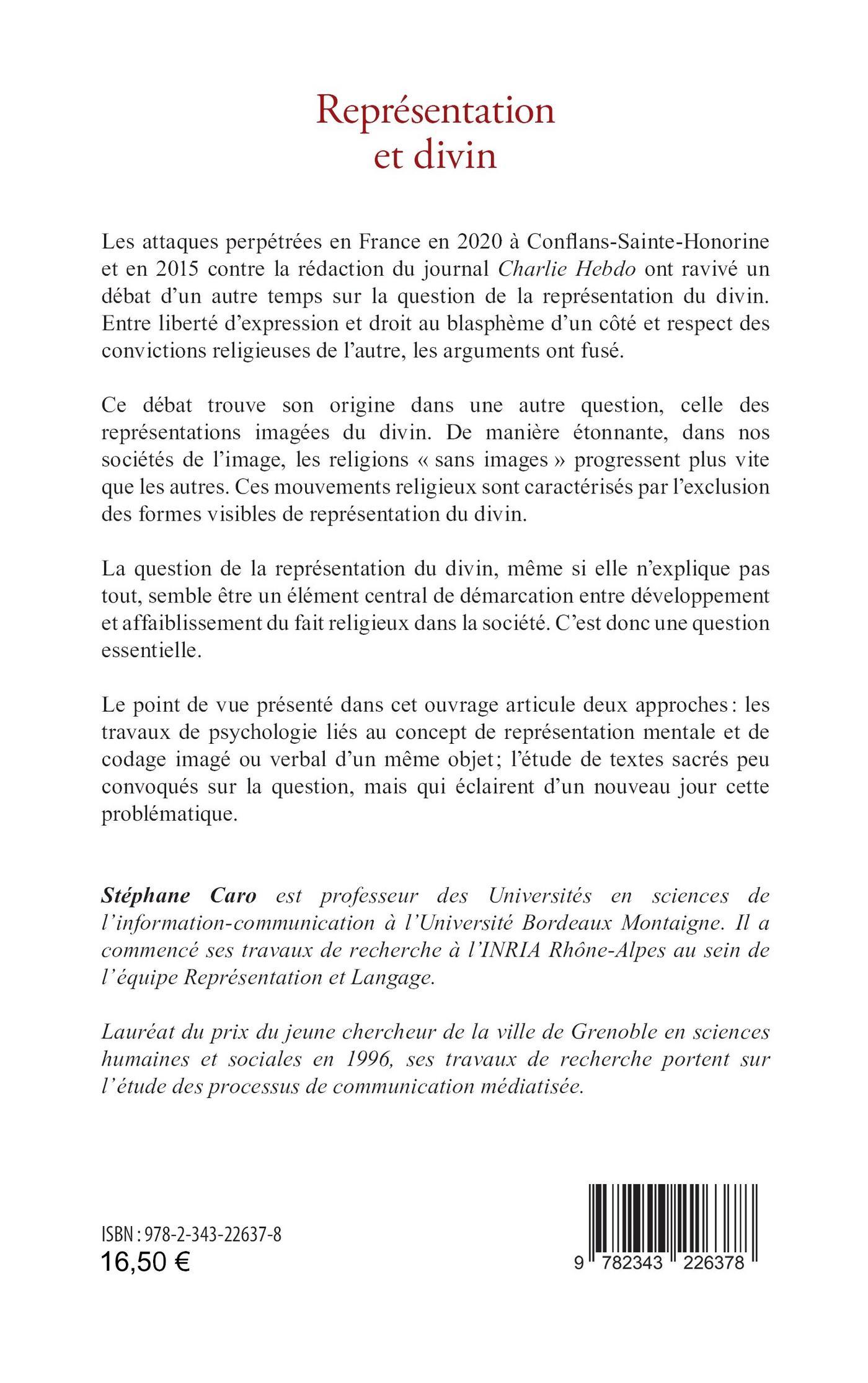 Les attaques perpétrées en France en 2020 à Conflans-Sainte-Honorine et en 2015 contre Charlie Hebdo ont ravivé un débat d’un autre temps sur la question de la représentation du divin. Entre liberté d’expression et droit au blasphème d’un côté et respect des convictions religieuses de l’autre, les arguments ont fusé. Ce débat trouve son origine dans une autre question, celle des représentations imagées du divin. De manière étonnante, dans nos sociétés de l’image, les religions « sans images » progressent plus vite que les autres. Ces mouvements religieux sont caractérisés par l’exclusion des formes visibles de représentation du divin. La question de la représentation du divin semble être un élément central de démarcation entre développement et affaiblissement du fait religieux. C’est donc une question essentielle. Cet ouvrage articule deux approches : les travaux de psychologie liés au concept de représentation mentale et de codage imagé ou verbal d’un même objet ; l’étude de textes sacrés qui éclairent d’un nouveau jour cette problématique.