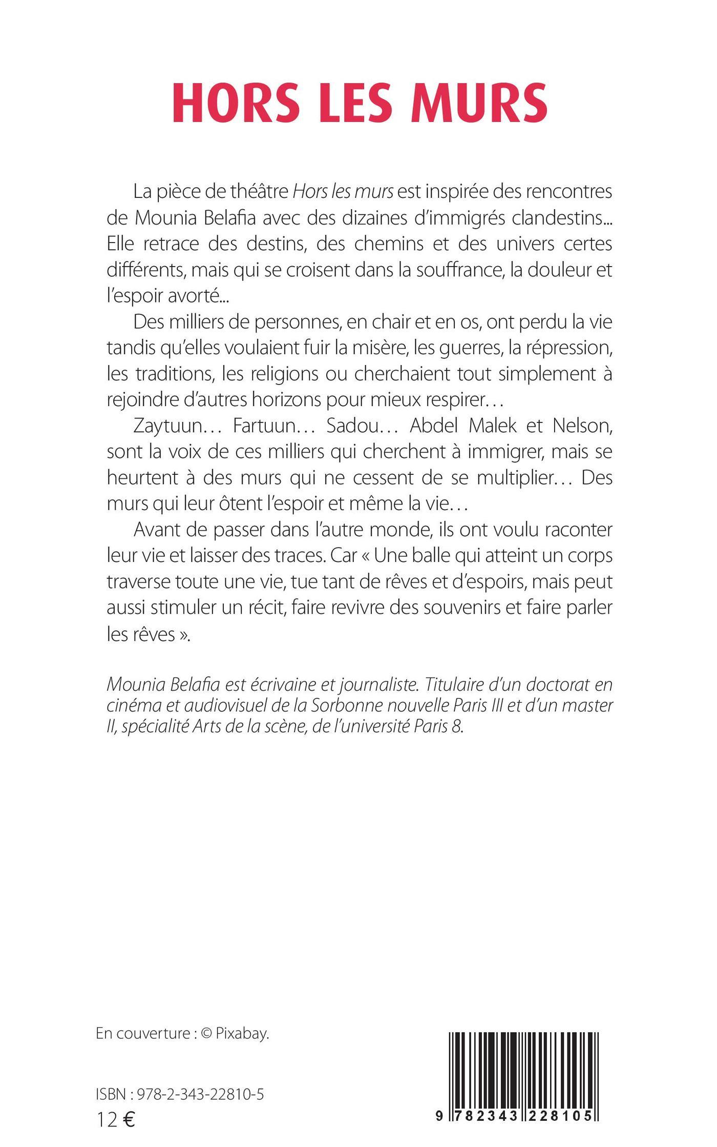 La pièce de théâtre Hors les murs est inspirée des rencontres de Mounia Belafia avec des dizaines d'immigrés clandestins... Elle retrace des destins, des chemins et des univers certes différents, mais qui se croisent dans la souffrance, la douleur et l'espoir avorté...Des milliers de personnes, en chair et en os, ont perdu la vie tandis qu'elles voulaient fuir la misère, les guerres, la répression, les traditions, les religions ou cherchaient tout simplement à rejoindre d'autres horizons pour mieux respirer... Zaytuun... Fartuun... Sadou... Abdel Malek et Nelson, sont la voix de ces milliers qui cherchent à immigrer, mais se heurtent à des murs qui ne cessent de se multiplier... Des murs qui leur ôtent l'espoir et même la vie.