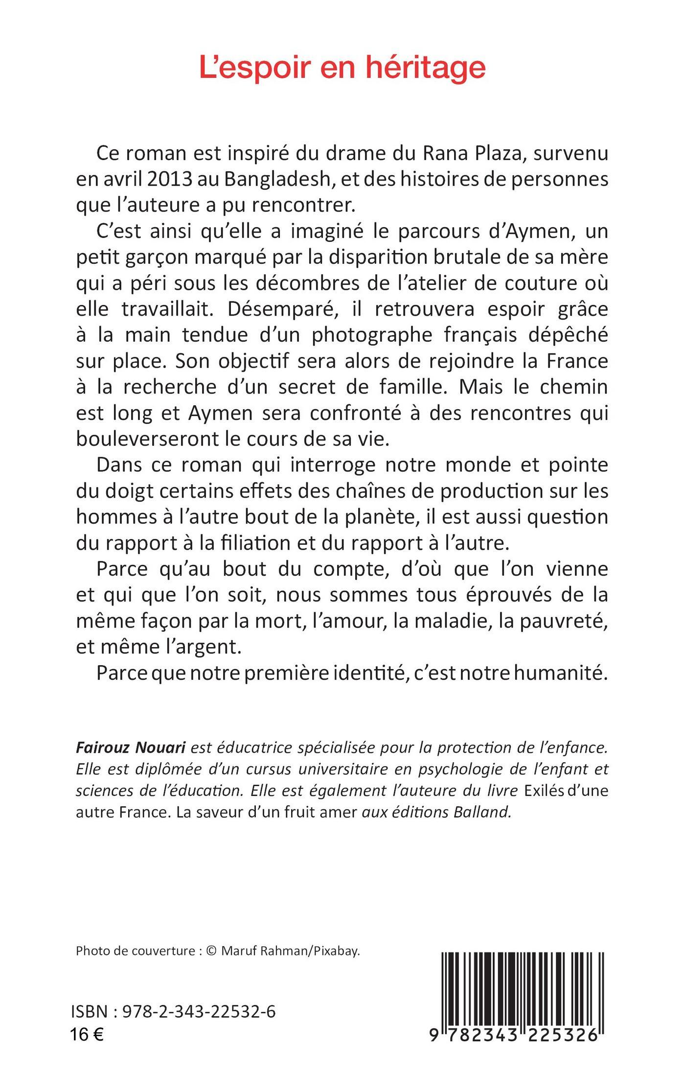 Ce roman est inspiré du drame du Rana Plaza, survenu en avril 2013 au Bangladesh, et des histoires de personnes que l’auteure a pu rencontrer. C’est ainsi qu’elle a imaginé le parcours d’Aymen, un petit garçon marqué par la disparition brutale de sa mère qui a péri sous les décombres de l’atelier de couture où elle travaillait. Désemparé, il retrouvera espoir grâce à la main tendue d’un photographe français dépêché sur place. Son objectif sera alors de rejoindre la France à la recherche d’un secret de famille. Mais le chemin est long et Aymen sera confronté à des rencontres qui bouleverseront le cours de sa vie. Dans ce roman qui interroge notre monde et pointe du doigt certains effets des chaînes de production sur les hommes à l’autre bout de la planète, il est aussi question du rapport à la filiation et du rapport à l’autre. Parce qu’au bout du compte, d’où que l’on vienne et qui que l’on soit, nous sommes tous éprouvés de la même façon par la mort, l’amour, la maladie, la pauvreté, et même l’argent.Parce que notre première identité, c’est notre humanité.