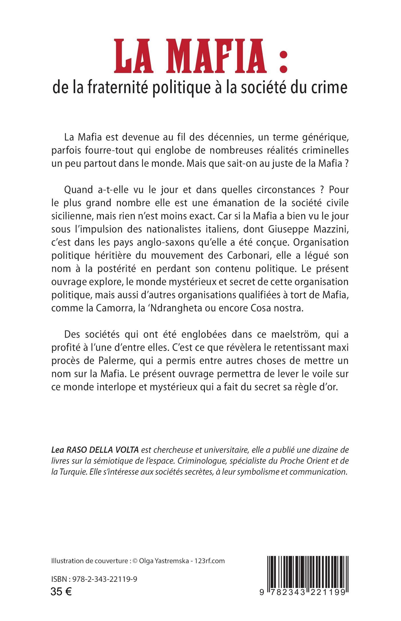La Mafia est devenue au fil des décennies, un terme générique, parfois fourre-tout qui englobe de nombreuses réalités criminelles un peu partout dans le monde. Mais que sait-on au juste de la Mafia ? Quand a-t-elle vu le jour et dans quelles circonstances ? Pour le plus grand nombre elle est une émanation de la société civile sicilienne, mais rien n’est moins exact. Car si la Mafia a bien vu le jour sous l’impulsion des nationalistes italiens, dont Giuseppe Mazzini, c’est dans les pays anglo-saxons qu’elle a été conçue. Organisation politique héritière du mouvement des Carbonari, elle a légué son nom à la postérité en perdant son contenu politique. Cet ouvrage explore le monde mystérieux et secret de cette organisation politique, mais aussi d’autres organisations qualifiées à tort de Mafia, comme la Camorra, la ‘Ndrangheta ou encore Cosa nostra.