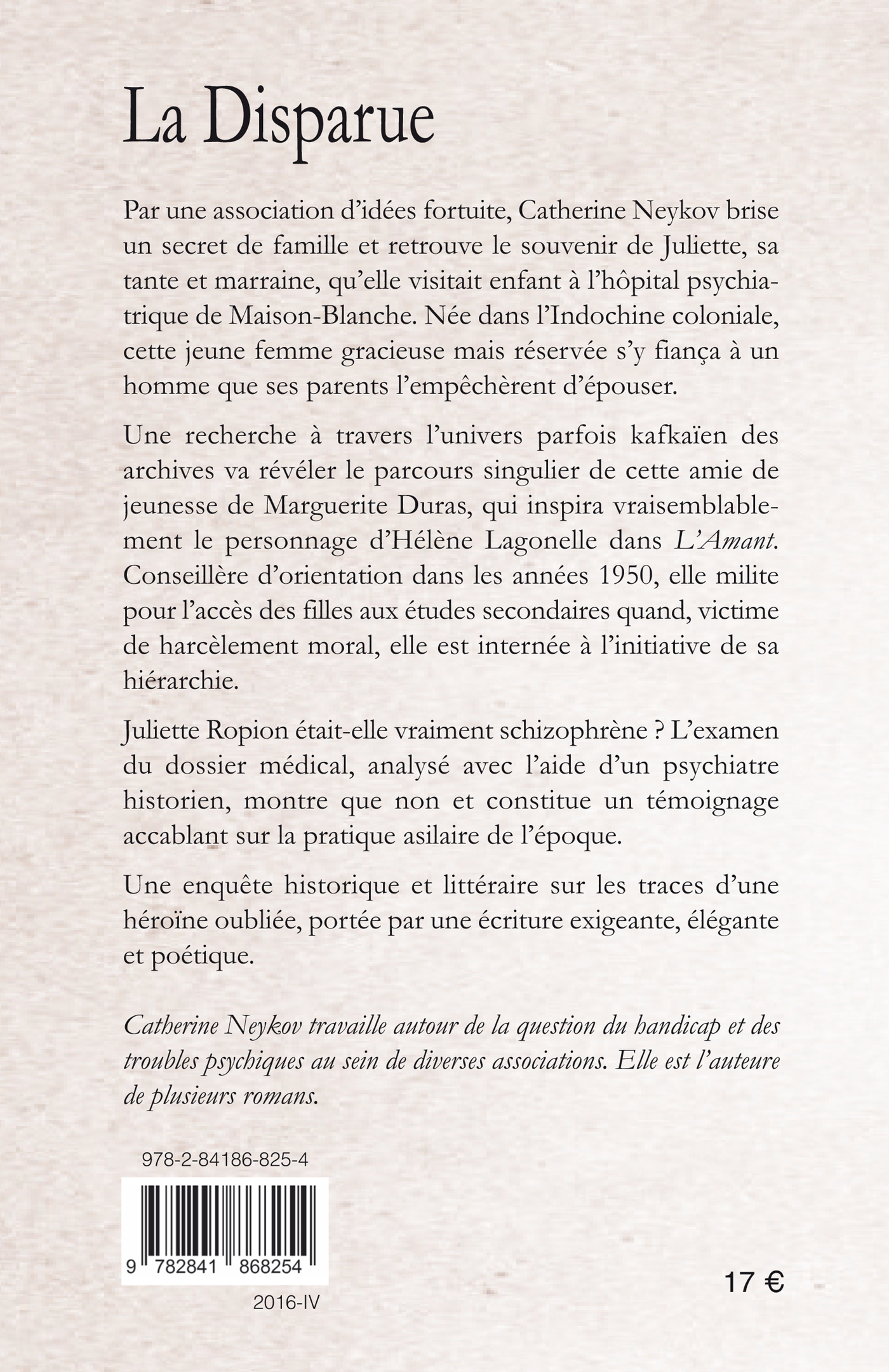 Par une association d'idées fortuite, Catherine Neykov brise un secret de famille et retrouve le souvenir de Juliette, sa tante et marraine, qu'elle visitait enfant à l'hôpital psychiatrique de Maison-Blanche. Née dans l'Indochine coloniale, cette jeune femme gracieuse mais réservée s'y fiança à un homme que ses parents l'empêchèrent d'épouser.Une recherche à travers l'univers parfois kafkaïen des archives va révéler le parcours singulier de cette amie de jeunesse de Marguerite Duras, qui inspira vraisemblablement le personnage d'Hélène Lagonelle dans "L'Amant". Conseillère d'orientation dans les années 1950, elle milite pour l'accès des filles aux études secondaires quand, victime de harcèlement moral, elle est internée à l'initiative de sa hiérarchie.Juliette Ropion était-elle vraiment schizophrène ? L'examen du dossier médical, analysé avec l'aide d'un psychiatre historien, montre que non et constitue un témoignage accablant sur la pratique asilaire de l'époque.Une enquête historique et littéraire sur les traces d'une héroïne oubliée, portée par une écriture exigeante, élégante et poétique.