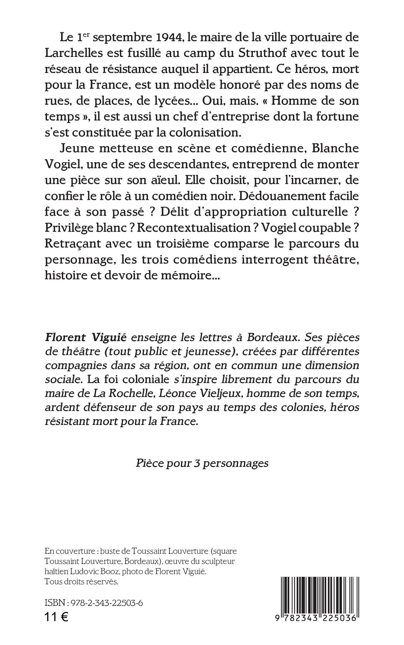 Le 1er septembre 1944, le maire de la ville portuaire de Larchelles est fusillé au camp du Struthof avec tout le réseau de résistance auquel il appartient. Ce héros, mort pour la France, est un modèle honoré par des noms de rues, de places, de lycées... Oui, mais. « Homme de son temps », il est aussi un chef d’entreprise dont la fortune s’est constituée par la colonisation. Jeune metteuse en scène et comédienne, Blanche Vogiel, une de ses descendantes, entreprend de monter une pièce sur son aïeul. Elle choisit, pour l’incarner, de confier le rôle à un comédien noir. Dédouanement facile face à son passé ? Délit d’appropriation culturelle ? Privilège blanc ? Recontextualisation ? Vogiel coupable ? Retraçant avec un troisième comparse le parcours du personnage, les trois comédiens interrogent théâtre, histoire et devoir de mémoire...