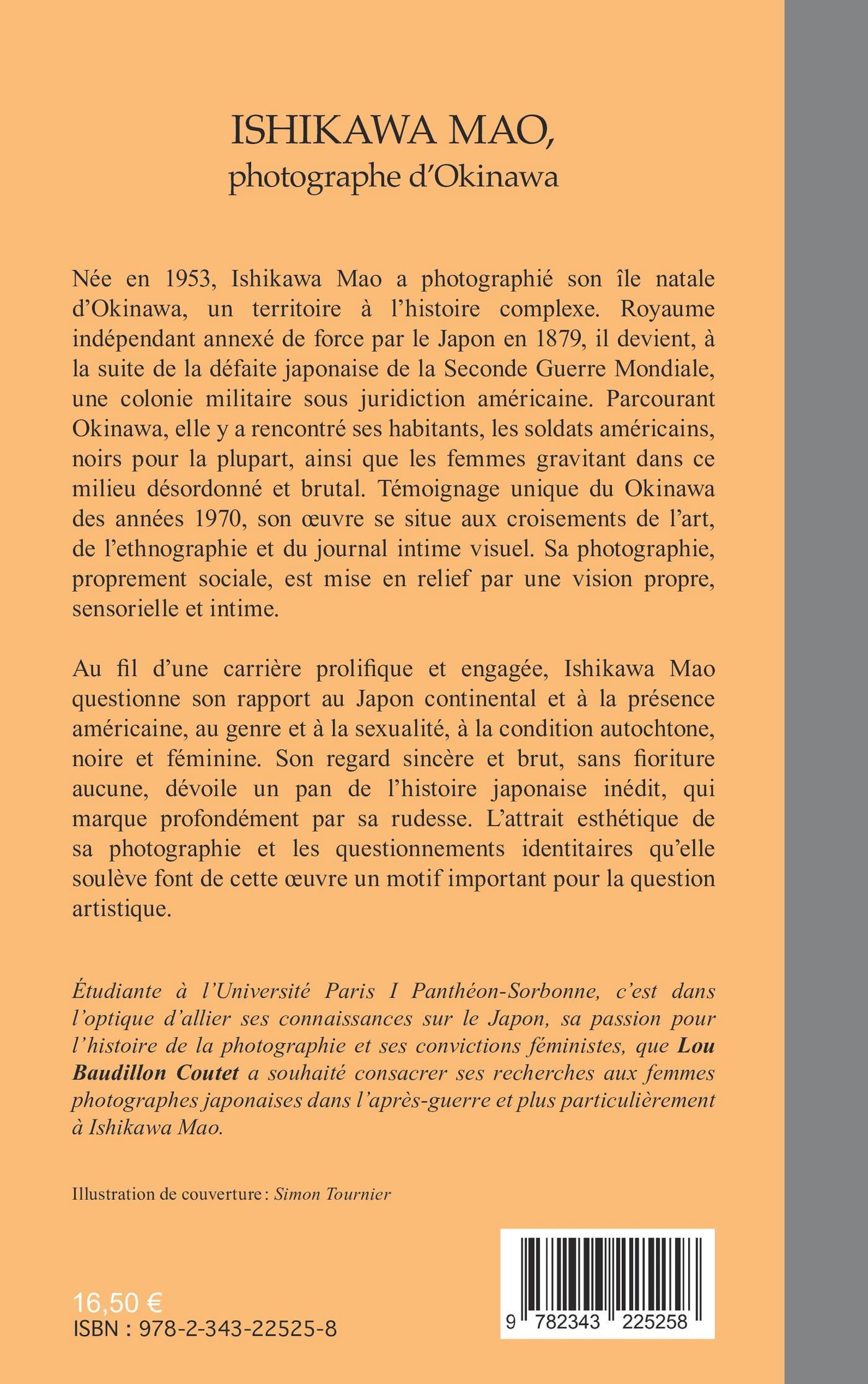 Née en 1953, Ishikawa Mao a photographié son île natale d’Okinawa, un territoire à l’histoire complexe. Royaume indépendant annexé de force par le Japon en 1879, il devient, à la suite de la défaite japonaise de la Seconde Guerre Mondiale, une colonie militaire sous juridiction américaine. Parcourant Okinawa, elle y a rencontré ses habitants, les soldats américains, noirs pour la plupart, ainsi que les femmes gravitant dans ce milieu désordonné et brutal. Témoignage unique du Okinawa des années 1970, son oeuvre se situe aux croisements de l’art, de l’ethnographie et du journal intime visuel. Sa photographie, proprement sociale, est mise en relief par une vision propre, sensorielle et intime. Au fil d’une carrière prolifique et ngagée, Ishikawa Mao questionne son rapport au Japon continental et à la présence américaine, au genre et à la sexualité, à la condition autochtone, noire et féminine. Son regard sincère et brut, sans fioriture aucune, dévoile un pan de l’histoire japonaise inédit, qui marque profondément par sa rudesse. L’attrait esthétique de sa photographie et les questionnements identitaires qu’elle soulève font de cette oeuvre un motif important pour la question artistique.