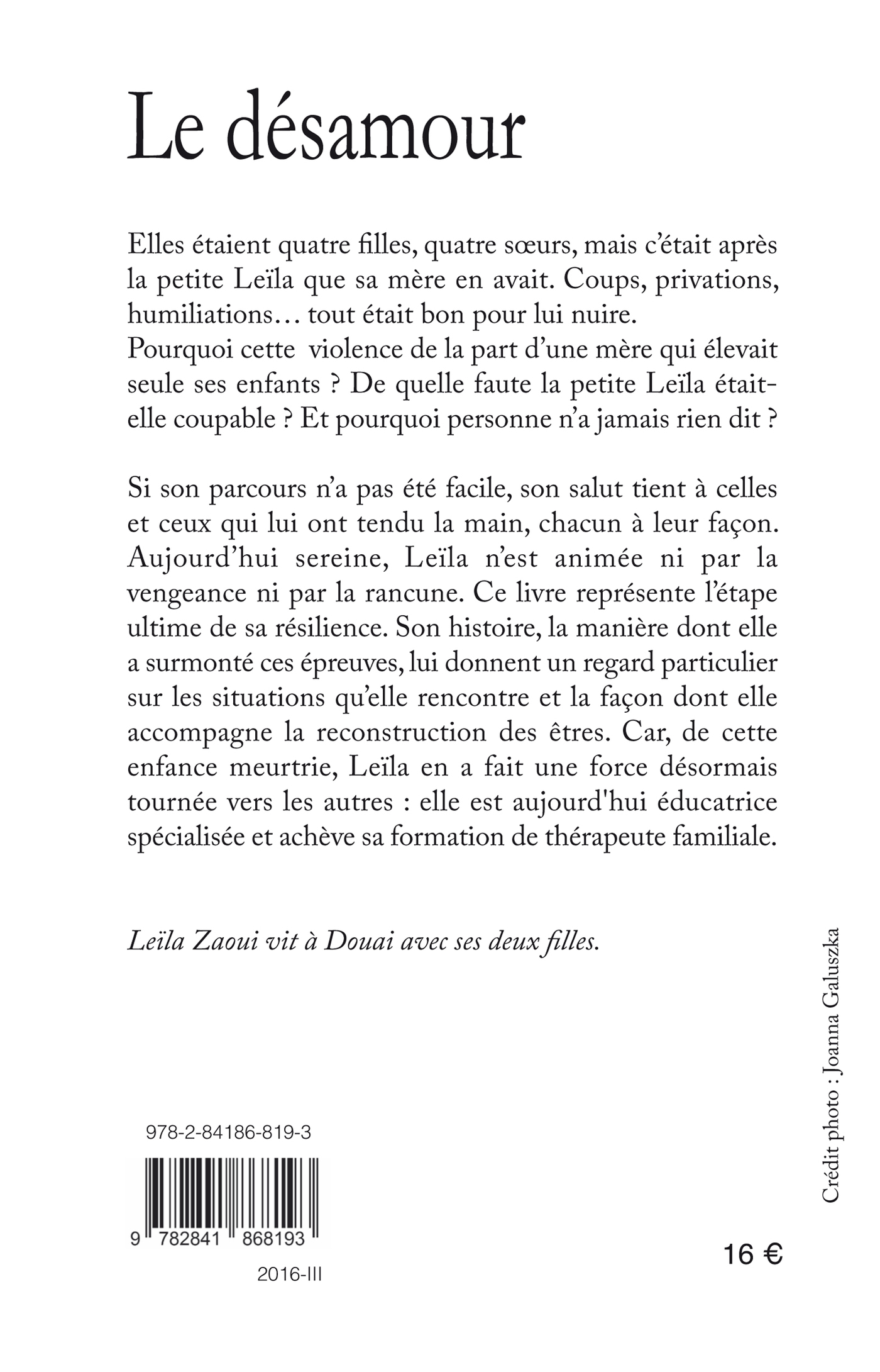 Elles étaient quatre filles, quatre surs, mais c'était après la petite Leïla que sa mère en avait. Coups, privations, humiliations tout était bon pour lui nuire.Pourquoi cette violence de la part d'une mère qui élevait seule ses enfants ? De quelle faute la petite Leïla était-elle coupable ? Et pourquoi personne n'a jamais rien dit ?Si son parcours n'a pas été facile, son salut tient à celles et ceux qui lui ont tendu la main, chacun à leur façon. Aujourd'hui sereine, Leïla n'est animée ni par la vengeance ni par la rancune. Ce livre représente l'étape ultime de sa résilience. Son histoire, la manière dont elle a surmonté ces épreuves, lui donnent un regard particulier sur les situations qu'elle rencontre et la façon dont elle accompagne la reconstruction des êtres. Car, de cette enfance meurtrie, Leïla en a fait une force désormais tournée vers les autres : elle est aujourd'hui éducatrice spécialisée et achève sa formation de thérapeute familiale.