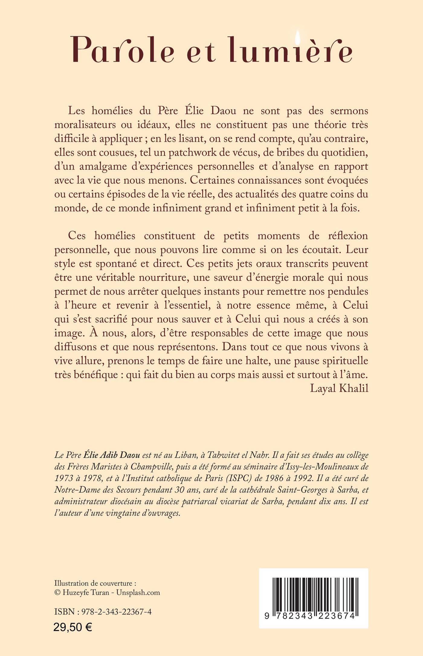 « Ces homélies ne sont pas des sermons moralisateurs ou idéaux, elles ne constituent pas une théorie très difficile à appliquer ; en les lisant, on se rend compte, qu’au contraire, elles sont cousues, tel un patchwork de vécus, de bribes du quotidien, d’un amalgame d’expériences personnelles et d’analyse en rapport avec la vie que nous menons. Ces homélies constituent de petits moments de réflexion personnelle. Leur style est spontané et direct. Ces petits jets oraux transcrits peuvent être une véritable nourriture, une saveur d’énergie morale qui nous permet de nous arrêter quelques instants pour remettre nos pendules à l’heure et revenir à l’essentiel. À nous, alors, d’être responsables de cette image que nous diffusons et que nous représentons. Dans tout ce que nous vivons à vive allure, prenons le temps de faire une halte, une pause spirituelle très bénéfique. » (Layal Khalil)