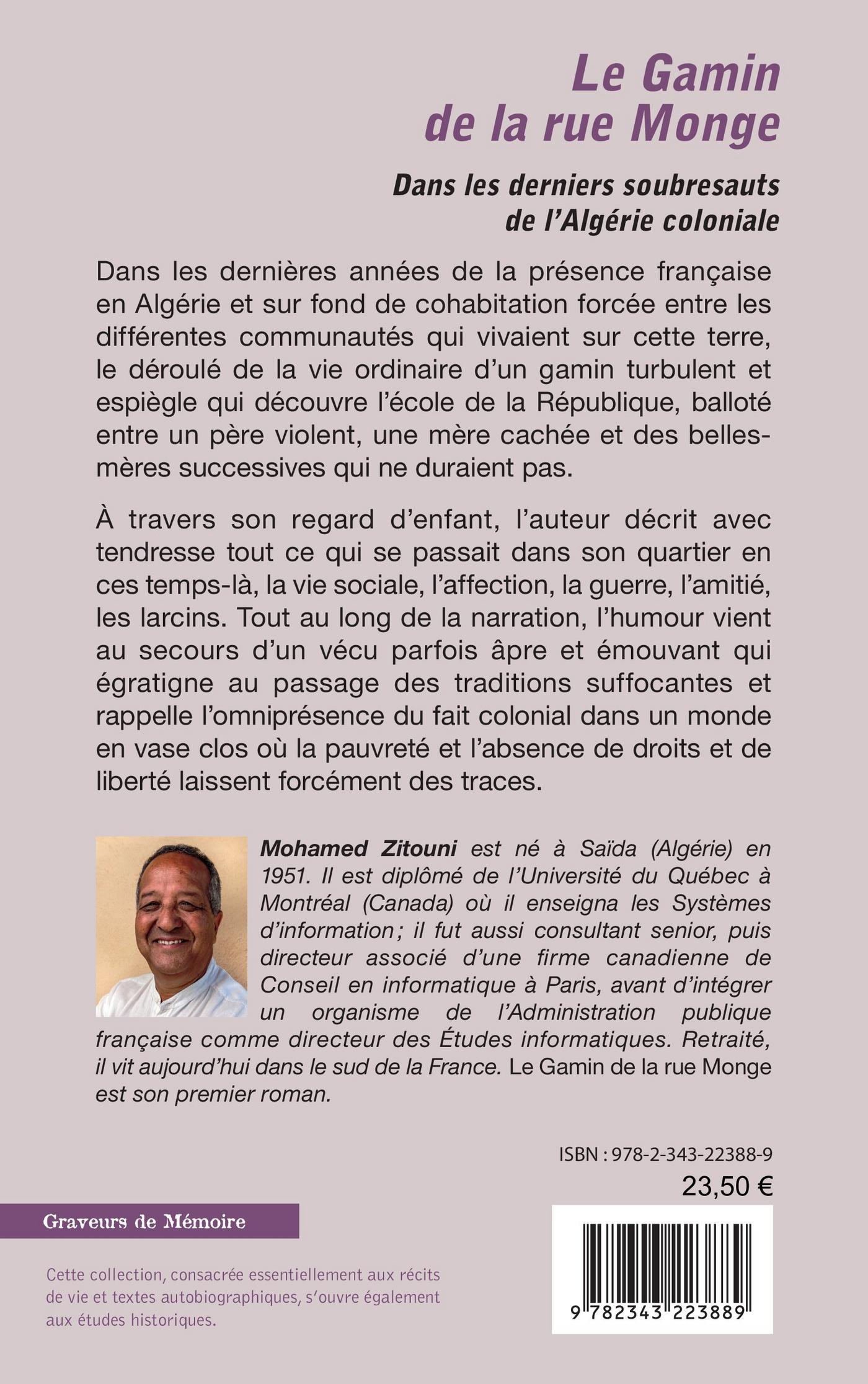 Se déroulant dans les dernières années de la présence française en Algérie et sur fond de cohabitation forcée entre les différentes communautés qui vivaient sur cette terre, le livre dévoile la vie ordinaire d’un gamin turbulent et espiègle qui découvre l’école de la République, balloté entre un père violent, une mère cachée et des belles-mères successives qui ne duraient pas. À travers son regard d’enfant, l’auteur décrit avec tendresse tout ce qui se passait dans son quartier en ces temps-là, la vie sociale, l’affection, la guerre, l’amitié, les larcins. Ce récit, parfois âpre et émouvant, égratigne au passage des traditions suffocantes et rappelle l’omniprésence du fait colonial dans un monde en vase clos où la pauvreté et l’absence de droits et de liberté laissent forcément des traces.