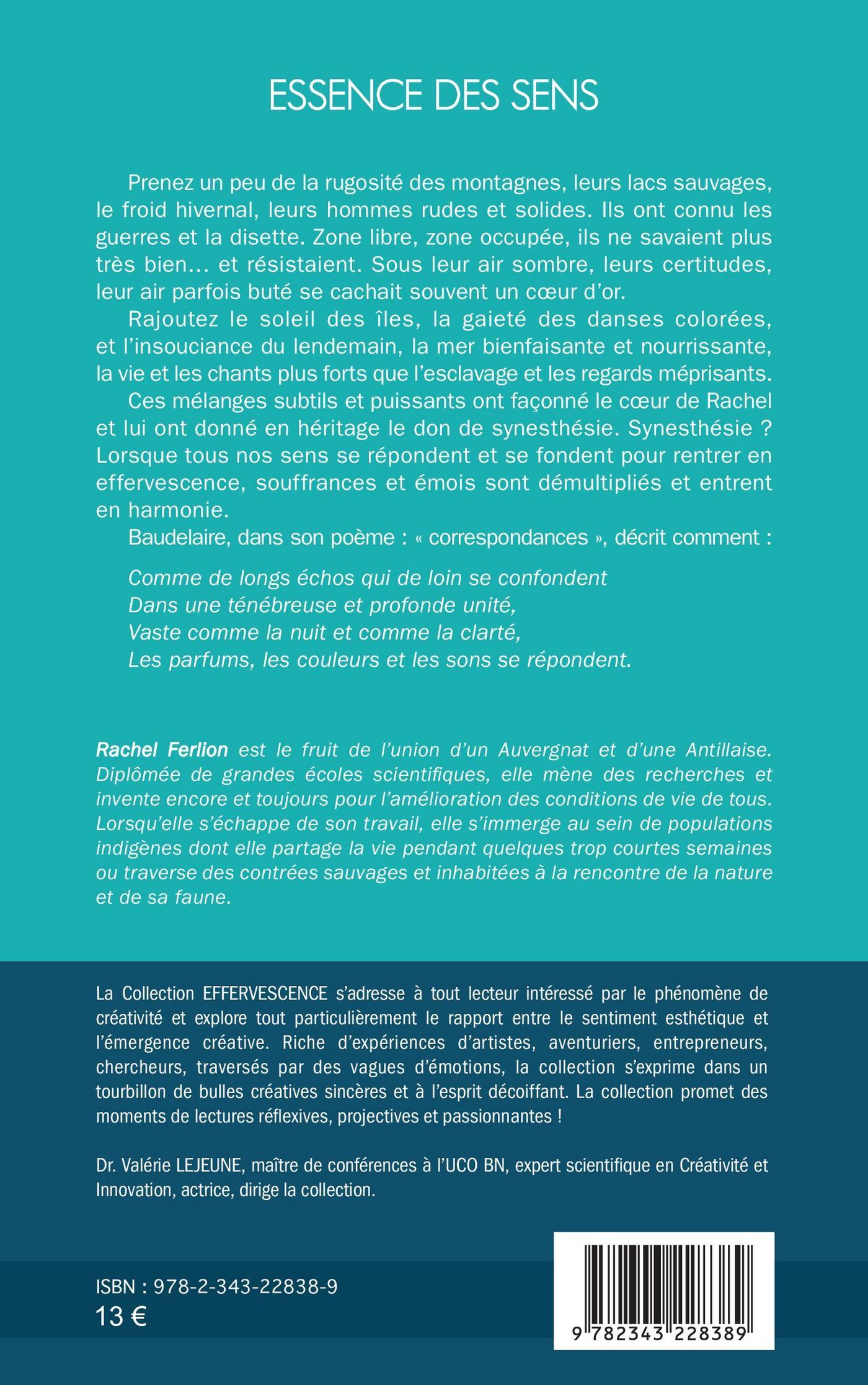 Prenez un peu de la rugosité des montagnes, leurs lacs sauvages, le froid hivernal, leurs hommes rudes et solides. Ils ont connu les guerres et la disette. Zone libre, zone occupée, ils ne savaient plus très bien... et résistaient. Sous leur air sombre, leurs certitudes, leur air parfois buté se cachait souvent un cœur d’or. Rajoutez le soleil des îles, la gaieté des danses colorées, et l’insouciance du lendemain, la mer bienfaisante et nourrissante, la vie et les chants plus forts que l’esclavage et les regards méprisants. Ces mélanges subtils et puissants ont façonné le cœur de Rachel et lui ont donné en héritage le don de synesthésie. Synesthésie ? Lorsque tous nos sens se répondent et se fondent pour rentrer en effervescence, souffrances et émois sont démultipliés et entrent en harmonie. Baudelaire, dans son poème : « correspondances », décrit comment :Comme de longs échos qui de loin se confondentDans une ténébreuse et profonde unité,Vaste comme la nuit et comme la clarté,Les parfums, les couleurs et les sons se répondent.