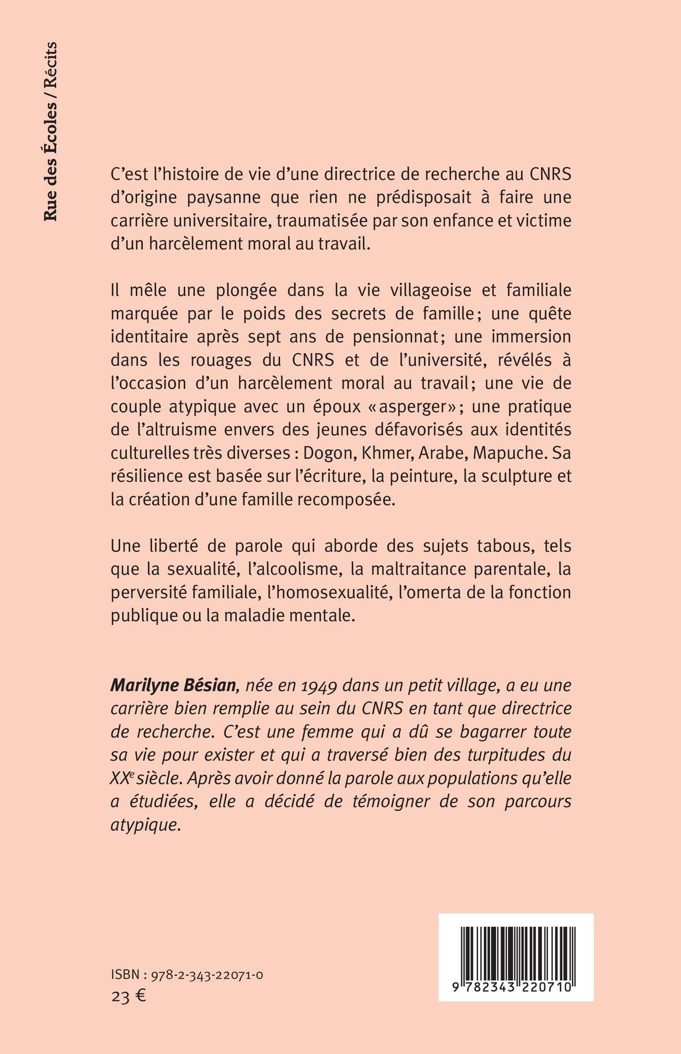 C’est l’histoire de vie d’une directrice de recherche au CNRS d’origine paysanne que rien ne prédisposait à faire une carrière universitaire. Il mêle une plongée dans la vie villageoise et familiale marquée par le poids des secrets de famille ; une quête identitaire après sept ans de pensionnat ; une immersion dans les rouages du CNRS et de l’université, révélés à l’occasion d’un harcèlement moral au travail ; une vie de couple atypique avec un époux « asperger » ; une pratique de l’altruisme envers des jeunes défavorisés aux identités culturelles très diverses : Dogon, Khmer, Arabe, Mapuche. Sa résilience est basée sur l’écriture, la peinture, la sculpture et la création d’une famille recomposée.