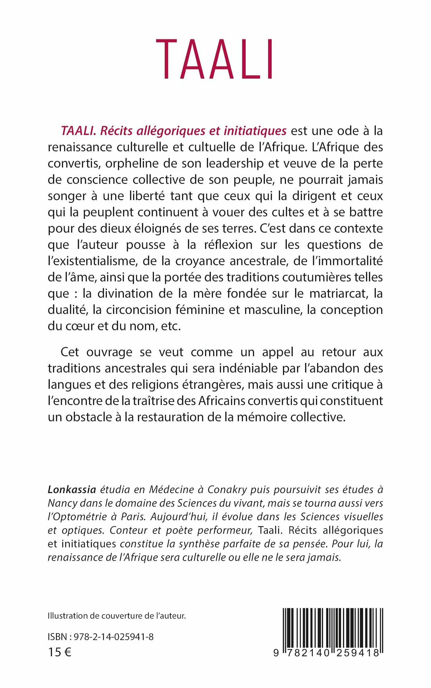 Taali. Récits allégoriques et initiatiques est une ode à la renaissance culturelle et cultuelle de l’Afrique. L’Afrique des convertis, orpheline de son leadership et veuve de la perte de conscience collective de son peuple, ne pourrait jamais songer à une liberté tant que ceux qui la dirigent et ceux qui la peuplent continuent à vouer des cultes et à se battre pour des dieux éloignés de ses terres. C’est dans ce contexte que l’auteur pousse à la réflexion sur les questions de l’existentialisme, de la croyance ancestrale, de l’immortalité de l’âme, ainsi que la portée des traditions coutumières telles que : la divination de la mère fondée sur le matriarcat, la dualité, la circoncision féminine et masculine, la conception du cœur et du nom, etc.