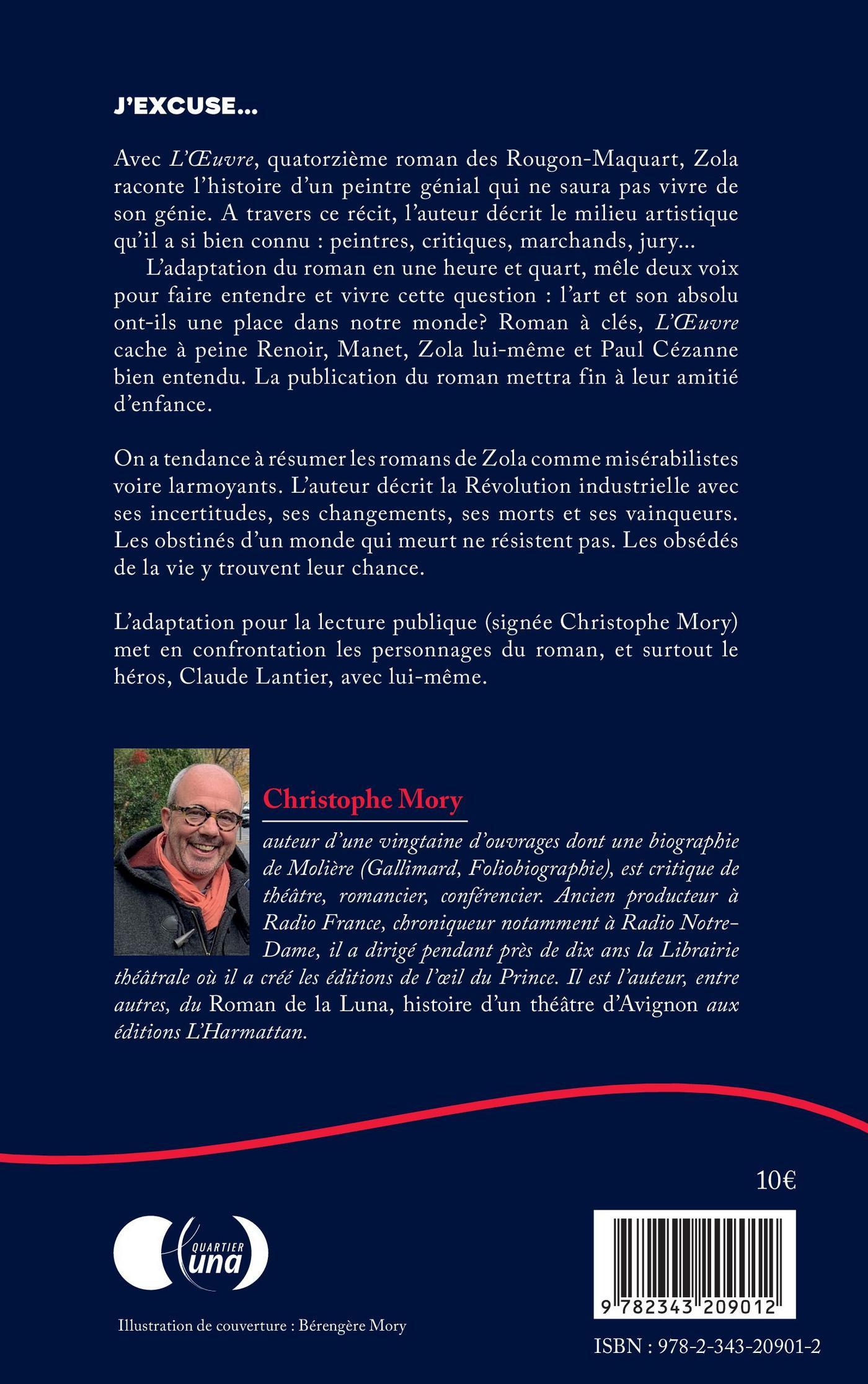 Avec L' uvre, quatorzième roman des Rougon-Maquart, Zola raconte l'histoire d'un peintre génial qui ne saura pas vivre de son génie. A travers ce récit, l'auteur décrit le milieu artistique qu'il a si bien connu : peintres, critiques, marchands, jury... L'adaptation du roman en une heure et quart, mêle deux voix pour faire entendre et vivre cette question : l'art et son absolu ont-ils une place dans notre monde? Roman à clés, L' uvre cache à peine Renoir, Manet, Zola lui-même et Paul Cézanne bien entendu. La publication du roman mettra fin à leur amitié d'enfance. On a tendance à résumer les romans de Zola comme misérabilistes voire larmoyants. L'auteur décrit la Révolution industrielle avec ses incertitudes, ses changements, ses morts et ses vainqueurs. Les obstinés d'un monde qui meurt ne résistent pas. Les obsédés de la vie y trouvent leur chance. L'adaptation pour la lecture publique (signée Christophe Mory) met en confrontation les personnages du roman, et surtout le héros, Claude Lantier, avec lui-même.