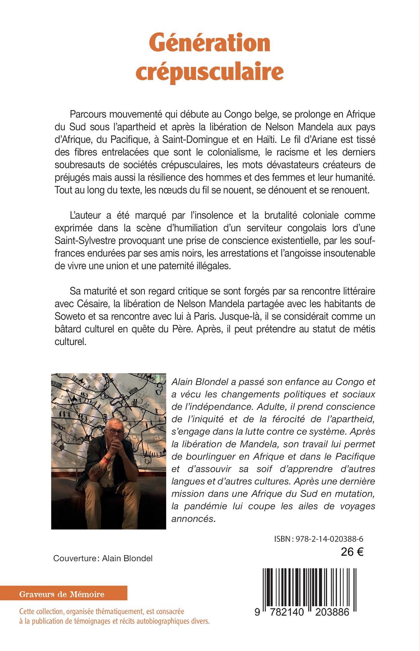 Parcours mouvementé qui débute au Congo belge, se prolonge en Afrique du Sud sous l’apartheid et après la libération de Nelson Mandela aux pays d’Afrique, du Pacifique, à Saint-Domingue et en Haïti. Le fil d’Ariane est tissé des fibres entrelacées que sont le colonialisme, le racisme et les derniers soubresauts de sociétés crépusculaires, les mots dévastateurs créateurs de préjugés mais aussi la résilience des hommes et des femmes et leur humanité. Tout au long du texte, les noeuds du fil se nouent, se dénouent et se renouent. L’auteur a été marqué par l’insolence et la brutalité coloniale comme exprimée dans la scène d’humiliation d’un serviteur congolais lors d’une Saint-Sylvestre provoquant une prise de conscience existentielle, par les souf- frances endurées par ses amis noirs, les arrestations et l’angoisse insoutenable de vivre une union et une paternité illégales. Sa maturité et son regard critique se sont forgés par sa rencontre littéraire avec Césaire, la libération de Nelson Mandela partagée avec les habitants de Soweto et sa rencontre avec lui à Paris. Jusque-là, il se considérait comme un bâtard culturel en quête du Père. Après, il peut prétendre au statut de métis culturel.