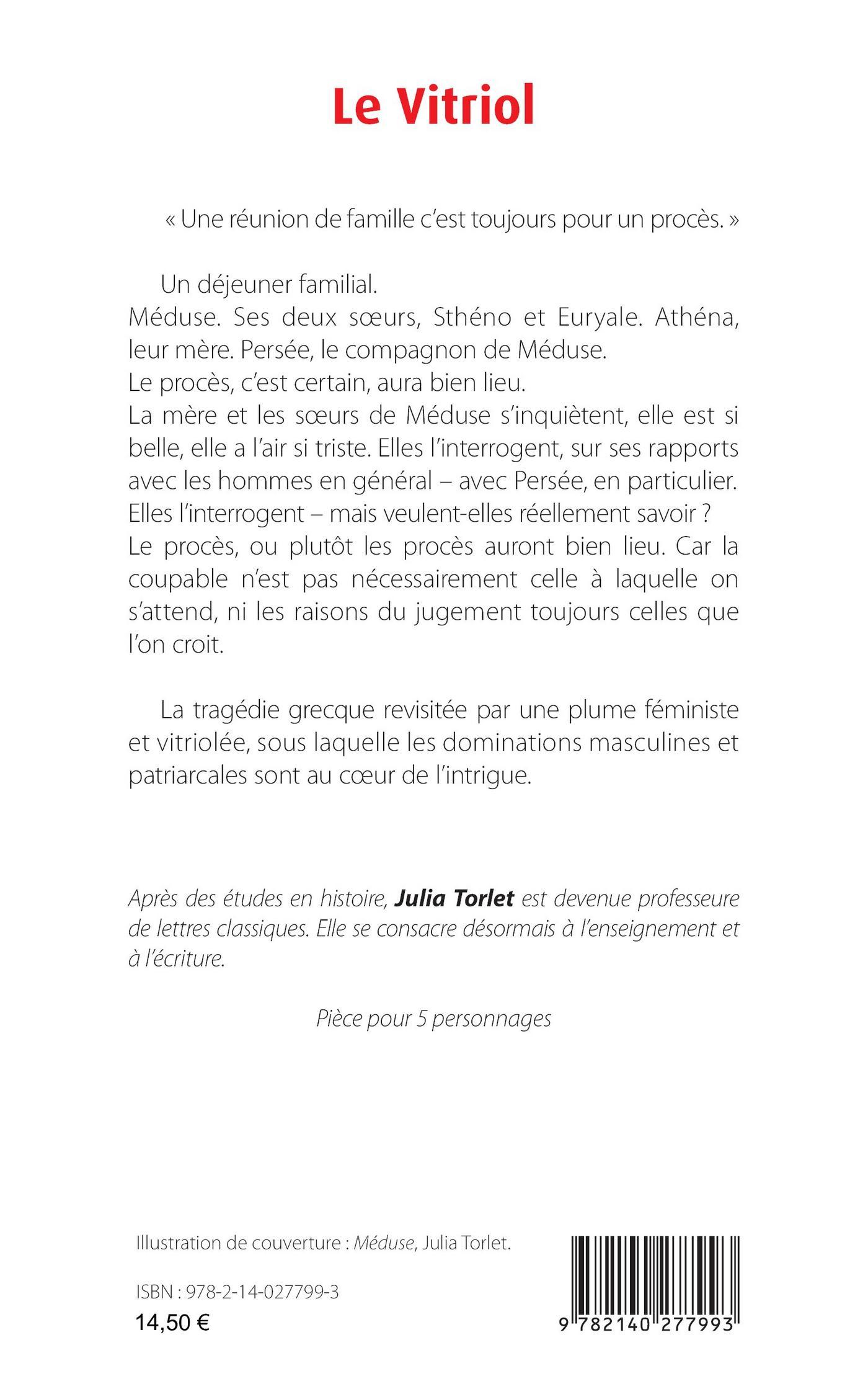 « Une réunion de famille c’est toujours pour un procès. »Un déjeuner familial. Méduse. Ses deux soeurs, Sthéno et Euryale. Athéna, leur mère. Persée, le compagnon de Méduse. Le procès, c’est certain, aura bien lieu.La mère et les soeurs de Méduse s’inquiètent, elle est si belle, elle a l’air si triste. Elles l’interrogent, sur ses rapports avec les hommes en général - avec Persée, en particulier. Elles l’interrogent - mais veulent-elles réellement savoir ? Le procès, ou plutôt les procès auront bien lieu. Car la coupable n’est pas nécessairement celle à laquelle on s’attend, ni les raisons du jugement toujours celles que l’on croit. La tragédie grecque revisitée par une plume féministe et vitriolée, sous laquelle les dominations masculines et patriarcales sont au coeur de l’intrigue.