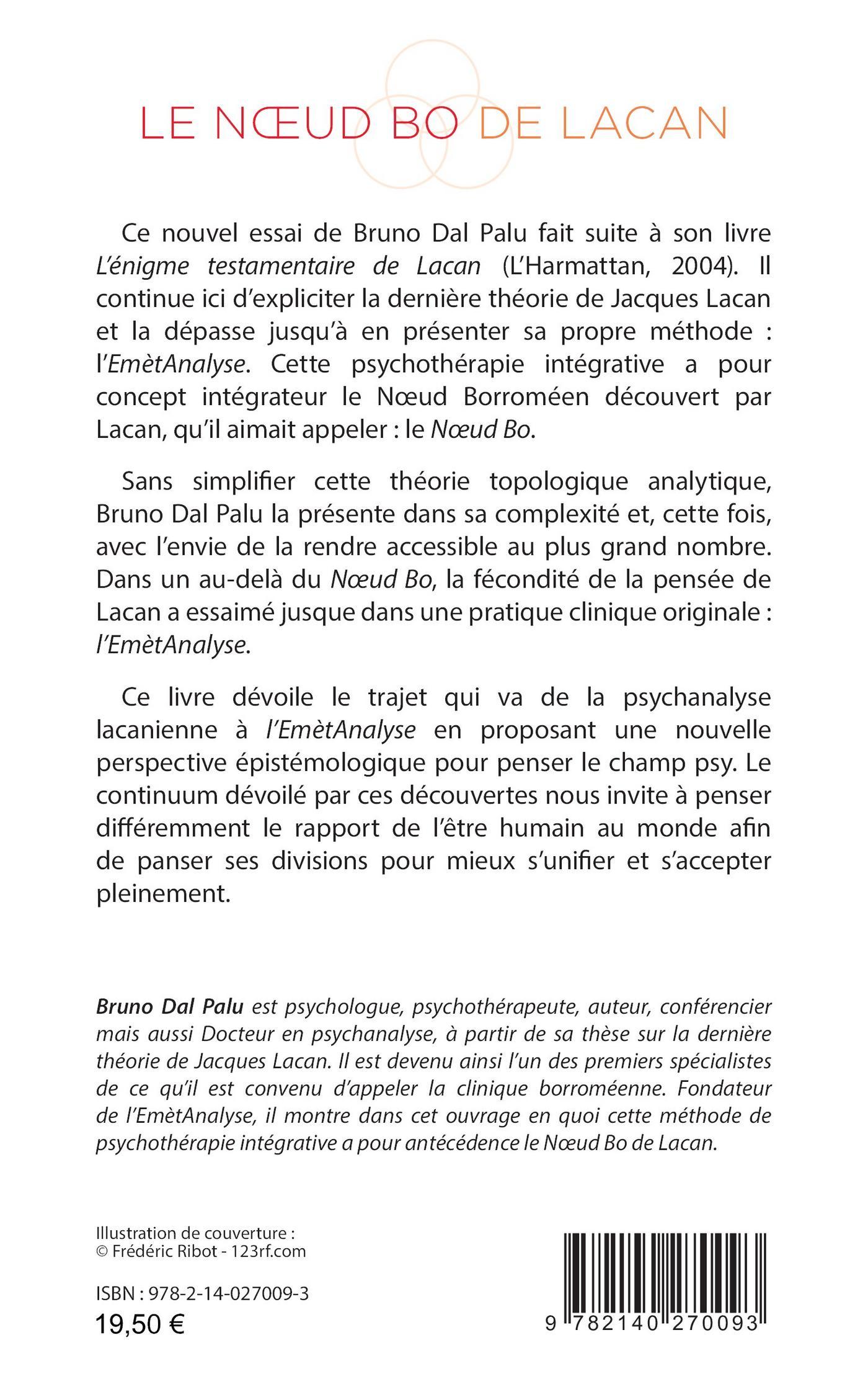 Ce nouvel essai de Bruno Dal Palu fait suite à son livre L’énigme testamentaire de Lacan (L’Harmattan, 2004). Il continue ici d’expliciter la dernière théorie de Jacques Lacan et la dépasse jusqu’à en présenter sa propre méthode : l’EmètAnalyse. Cette psychothérapie intégrative a pour concept intégrateur le Nœud Borroméen découvert par Lacan, qu’il aimait appeler : le Nœud Bo. Sans simplifier cette théorie topologique analytique, Bruno Dal Palu la présente dans sa complexité et, cette fois, avec l’envie de la rendre accessible au plus grand nombre. Dans un au-delà du Nœud Bo, la fécondité de la pensée de Lacan a essaimé jusque dans une pratique clinique originale : l’EmètAnalyse. Ce livre dévoile le trajet qui va de la psychanalyse lacanienne à l’EmètAnalyse en proposant une nouvelle perspective épistémologique pour penser le champ psy. Le continuum dévoilé par ces découvertes nous invite à penser différemment le rapport de l’être humain au monde afin de panser ses divisions pour mieux s’unifier et s’accepter pleinement.