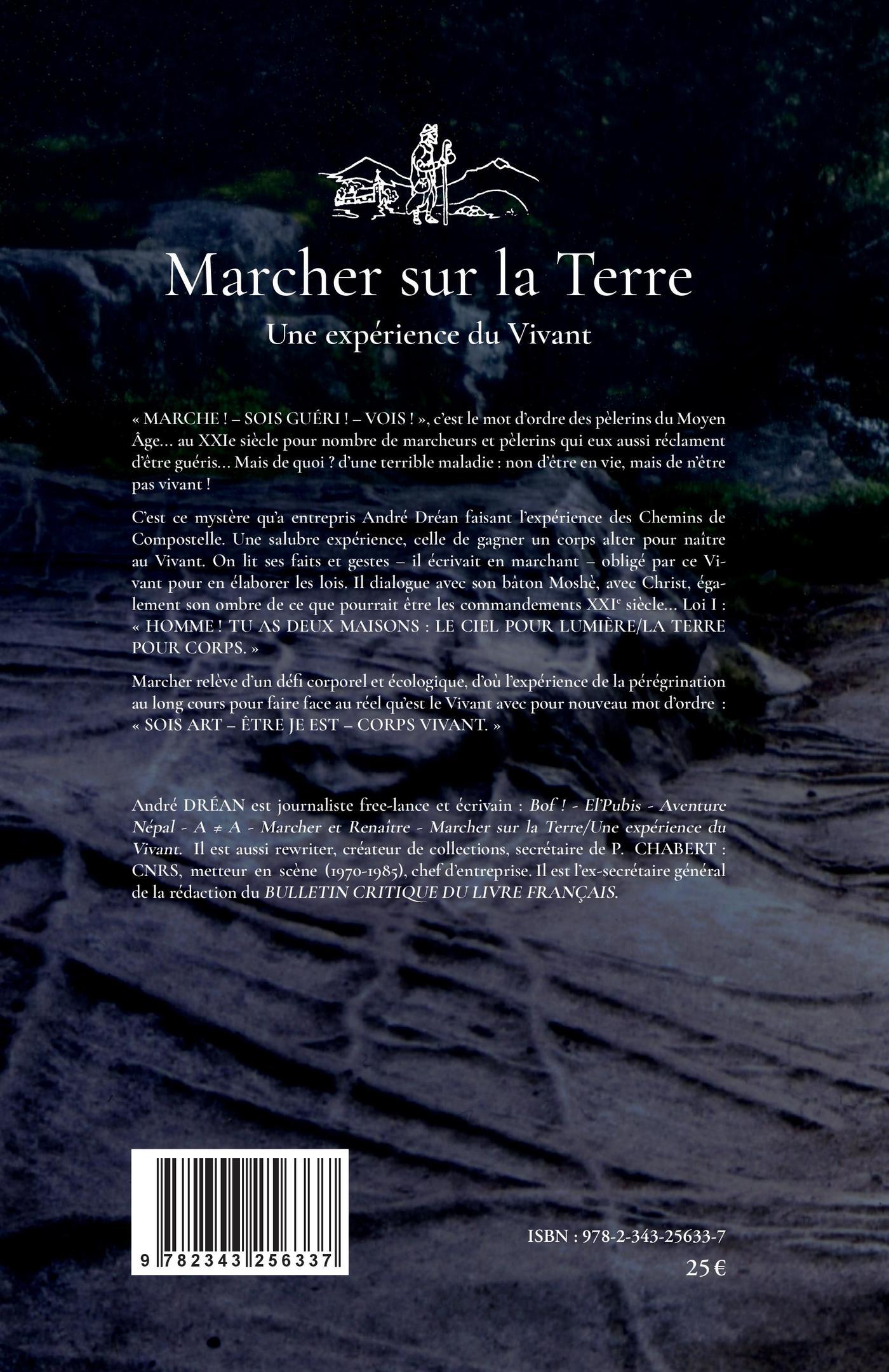 « MARCHE ! - SOIS GUÉRI ! - VOIS ! », c'est le mot d'ordre des pèlerins du Moyen Âge... au XXIe siècle pour nombre de marcheurs et pèlerins qui eux aussi réclament d'être guéris... Mais de quoi ? d'une terrible maladie : non d'être en vie, mais de n'être pas vivant ! C'est ce mystère qu'a entrepris André Dréan faisant l'expérience des Chemins de Compostelle. Une salubre expérience, celle de gagner un corps alter pour naître au Vivant. On lit ses faits et gestes - il écrivait en marchant - obligé par ce Vivant pour en élaborer les lois. Il dialogue avec son bâton Moshè, avec Christ, également son ombre de ce que pourrait être les commandements XXIe siècle... Loi I : « HOMME ! TU AS DEUX MAISONS : LE CIEL POUR LUMIÈRE/LA TERRE POUR CORPS. » Marcher relève d'un défi corporel et écologique, d'où l'expérience de la pérégrination au long cours pour faire face au réel qu'est le Vivant avec pour nouveau mot d'ordre : « SOIS ART - ÊTRE JE EST - CORPS VIVANT. »
