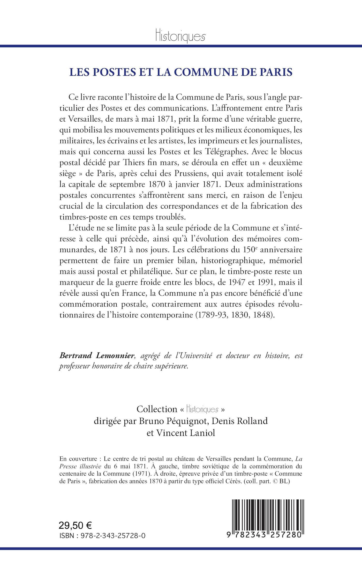 Ce livre raconte l’histoire de la Commune de Paris, sous l’angle particulier des Postes et des communications. L’affrontement entre Paris et Versailles, de mars à mai 1871, prit la forme d’une véritable guerre, qui mobilisa les mouvements politiques et les milieux économiques, les militaires, les écrivains et les artistes, les imprimeurs et les journalistes, mais qui concerna aussi les Postes et les Télégraphes. Avec le blocus postal décidé par Thiers fin mars, se déroula en effet un « deuxième siège » de Paris, après celui des Prussiens, qui avait totalement isolé la capitale de septembre 1870 à janvier 1871. Deux administrations postales concurrentes s’affrontèrent sans merci, en raison de l’enjeu crucial de la circulation des correspondances et de la fabrication des timbres-poste en ces temps troublés.L’étude ne se limite pas à la seule période de la Commune et s’intéresse à celle qui précède, ainsi qu’à l’évolution des mémoires communardes, de 1871 à nos jours. Les célébrations du 150e anniversaire permettent de faire un premier bilan, historiographique, mémoriel mais aussi postal et philatélique. Sur ce plan, le timbre-poste reste un marqueur de la guerre froide entre les blocs, de 1947 et 1991, mais il révèle aussi qu’en France, la Commune n’a pas encore bénéficié d’une commémoration postale, contrairement aux autres épisodes révolutionnaires de l’histoire contemporaine (1789-93, 1830, 1848).