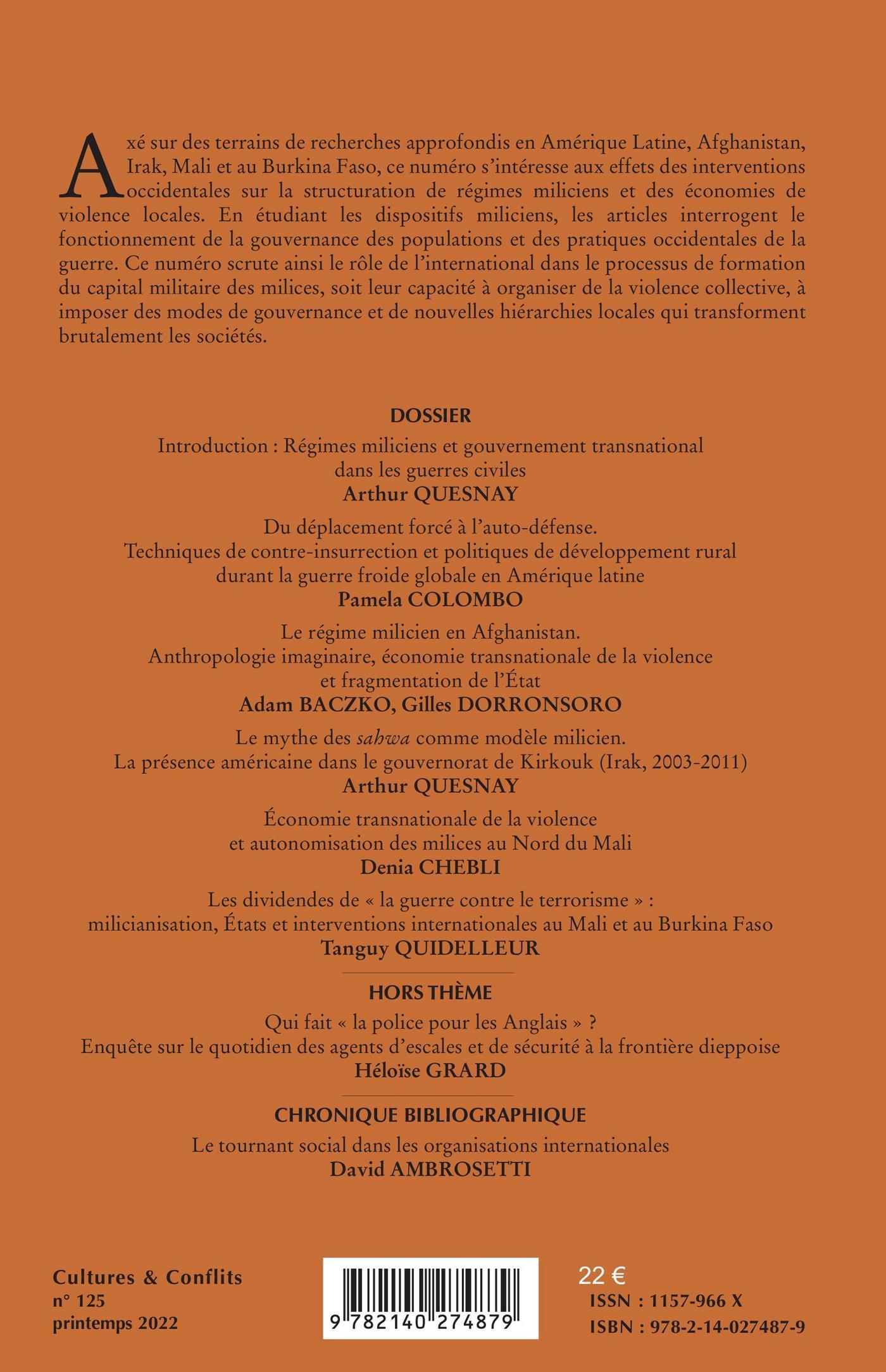 Axé sur des terrains de recherches approfondis en Amérique Latine, Afghanistan, Irak, Mali et au Burkina Faso, ce numéro s’intéresse aux effets des interventions occidentales sur la structuration de régimes miliciens et des économies deviolence locales. En étudiant les dispositifs miliciens, les articles interrogent le fonctionnement de la gouvernance des populations et des pratiques occidentales de la guerre. Ce numéro scrute ainsi le rôle de l’international dans le processus de formation du capital militaire des milices, soit leur capacité à organiser de la violence collective, à imposer des modes de gouvernance et de nouvelles hiérarchies locales qui transforment brutalement les sociétés.