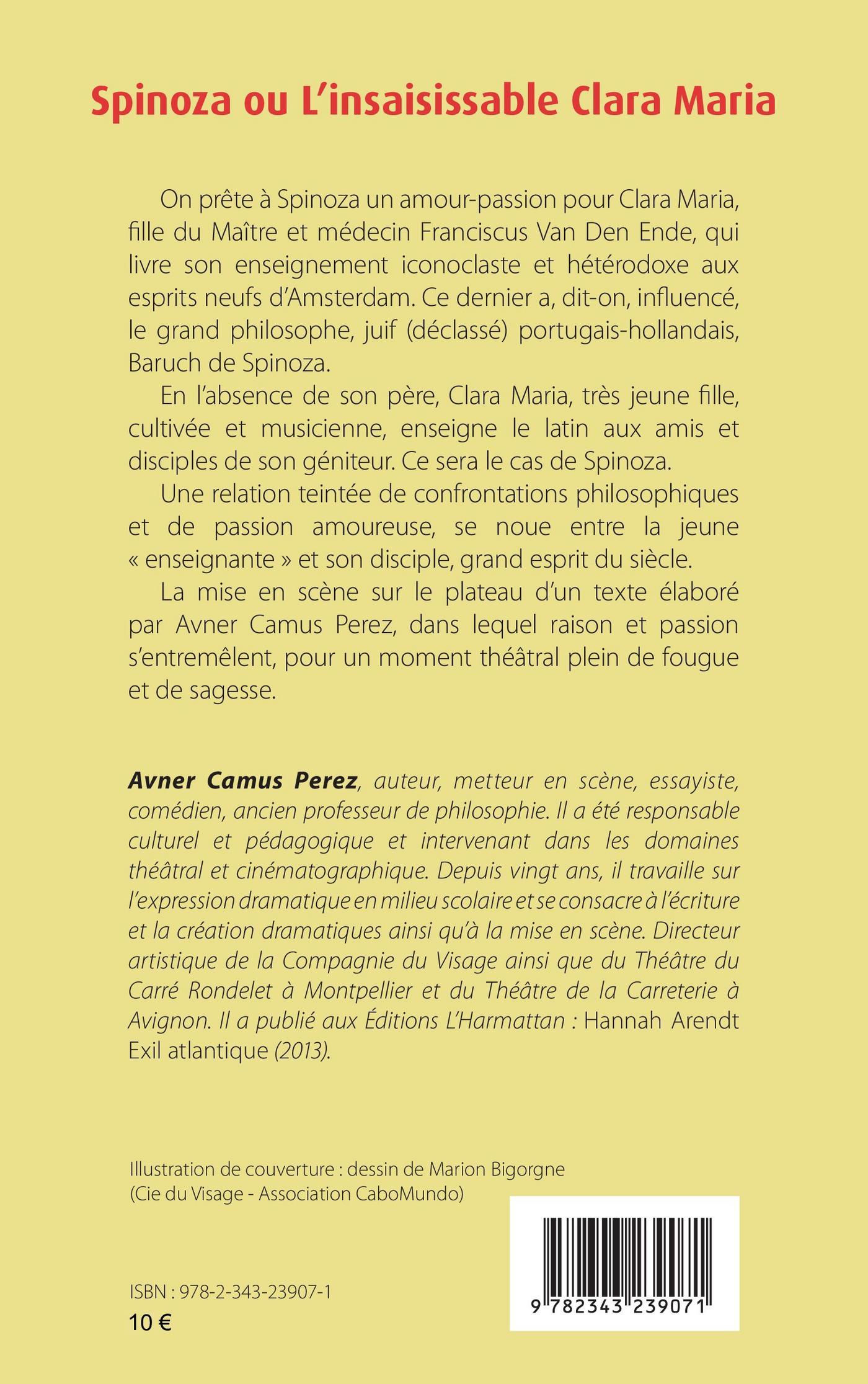 On prête à Spinoza un amour-passion pour Clara Maria, fille du Maître et médecin Franciscus Van Den Ende, qui livre son enseignement iconoclaste et hétérodoxe auxesprits neufs d’Amsterdam. Ce dernier a, dit-on, influencé, le grand philosophe, juif (déclassé) portugais-hollandais, Baruch de Spinoza. En l’absence de son père, Clara Maria, très jeune fille, cultivée et musicienne, enseigne le latin aux amis et disciples de son géniteur. Ce sera le cas de Spinoza. Une relation teintée de confrontations philosophiqueset de passion amoureuse, se noue entre la jeune « enseignante » et son disciple, grand esprit du siècle. La mise en scène sur le plateau d’un texte élaboré par Avner Camus Perez, dans lequel raison et passion s’entremêlent, pour un moment théâtral plein de fougue et de sagesse.