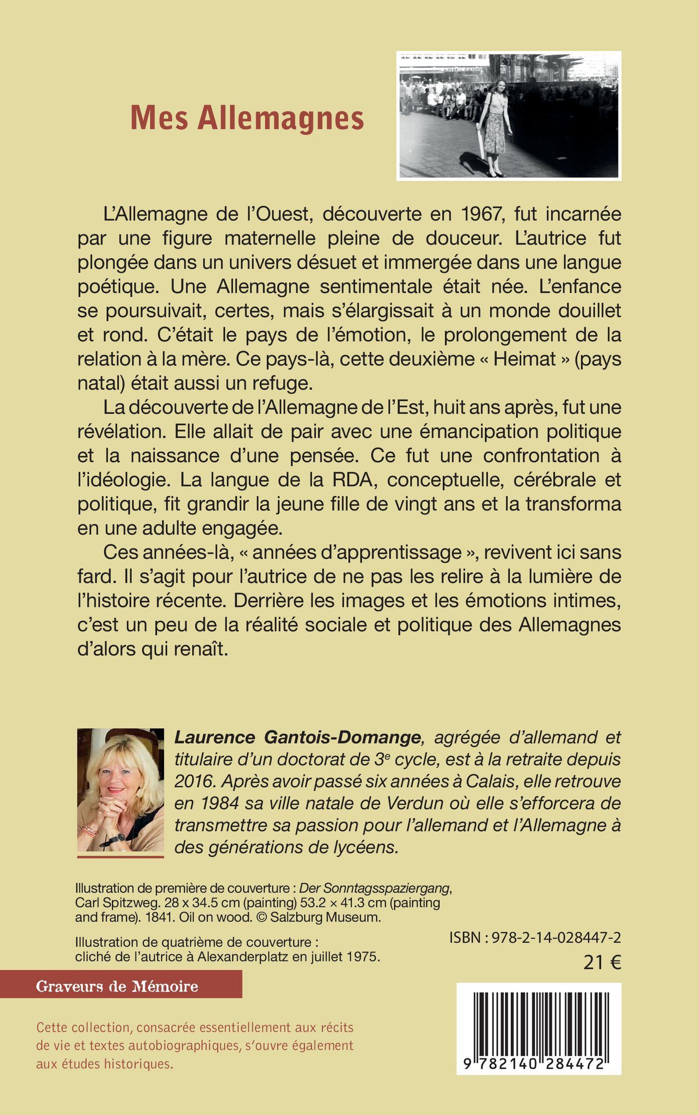 L’Allemagne de l’Ouest, découverte en 1967, fut incarnée par une figure maternelle pleine de douceur. L’autrice fut plongée dans un univers désuet et immergée dans une langue poétique. Une Allemagne sentimentale était née. L’enfance se poursuivait, certes, mais s’élargissait à un monde douillet et rond. C’était le pays de l’émotion, le prolongement de la relation à la mère. Ce pays-là, cette deuxième « Heimat » (pays natal) était aussi un refuge. La découverte de l’Allemagne de l’Est, huit ans après, fut une révélation. Elle allait de pair avec une émancipation politique et la naissance d’une pensée. Ce fut une confrontation à l’idéologie. La langue de la RDA, conceptuelle, cérébrale et politique, fit grandir la jeune fille de vingt ans et la transforma en une adulte engagée. Ces années-là, « années d’apprentissage », revivent ici sans fard. Il s’agit pour l’autrice de ne pas les relire à la lumière de l’histoire récente. Derrière les images et les émotions intimes, c’est un peu de la réalité sociale et politique des Allemagnes d’alors qui renaît.