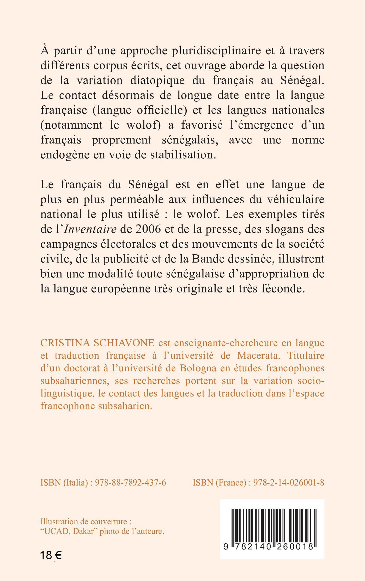 À partir d’une approche pluridisciplinaire et à travers différents corpus écrits, cet ouvrage aborde la question de la variation diatopique du français au Sénégal. Le contact désormais de longue date entre la langue française (langue officielle) et les langues nationales (notamment le wolof) a favorisé l’émergence d’un français proprement sénégalais, avec une norme endogène en voie de stabilisation. Le français du Sénégal est en effet une langue de plus en plus perméable aux influences du véhiculaire national le plus utilisé : le wolof. Les exemples tirés de l’Inventaire de 2006 et de la presse, des slogans des campagnes électorales et des mouvements de la société civile, de la publicité et de la Bande dessinée, illustrent bien une modalité toute sénégalaise d’appropriation de la langue européenne très originale et très féconde.