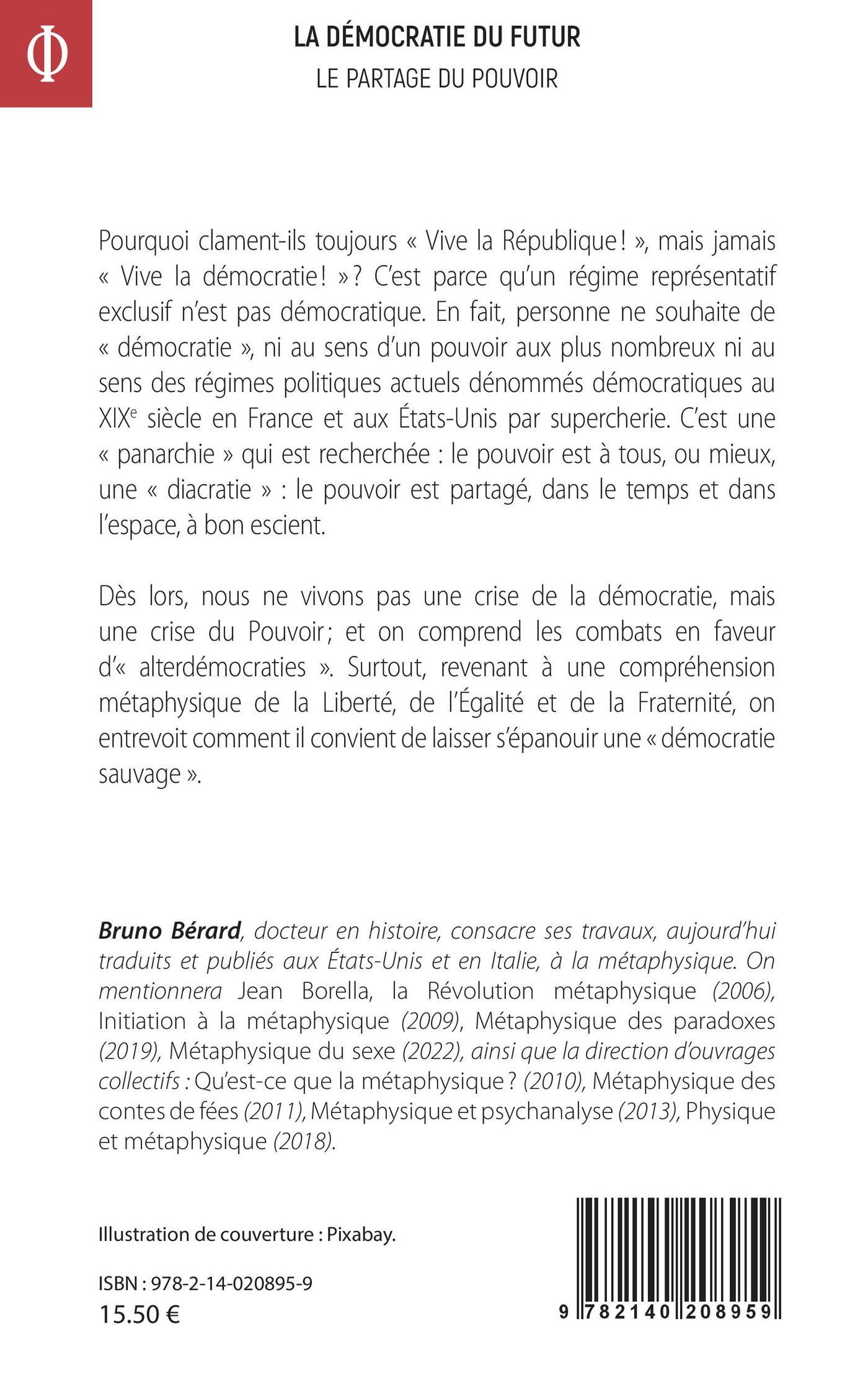 Pourquoi clament-ils toujours « Vive la République ! », mais jamais « Vive la démocratie ! » ? C'est parce qu'un régime représentatif exclusif n'est pas démocratique. En fait, personne ne souhaite de « démocratie », ni au sens d'un pouvoir aux plus nombreux ni au sens des régimes politiques actuels dénommés démocratiques au XIXe siècle en France et aux États-Unis par supercherie. C'est une « panarchie » qui est recherchée : le pouvoir est à tous, ou mieux, une « diacratie » : le pouvoir est partagé, dans le temps et dans l'espace, à bon escient. Dès lors, nous ne vivons pas une crise de la démocratie, mais une crise du Pouvoir ; et on comprend les combats en faveur d'« alterdémocraties ». Surtout, revenant à une compréhension métaphysique de la Liberté, de l'Égalité et de la Fraternité, on entrevoit comment il convient de laisser s'épanouir une « démocratie sauvage ».
