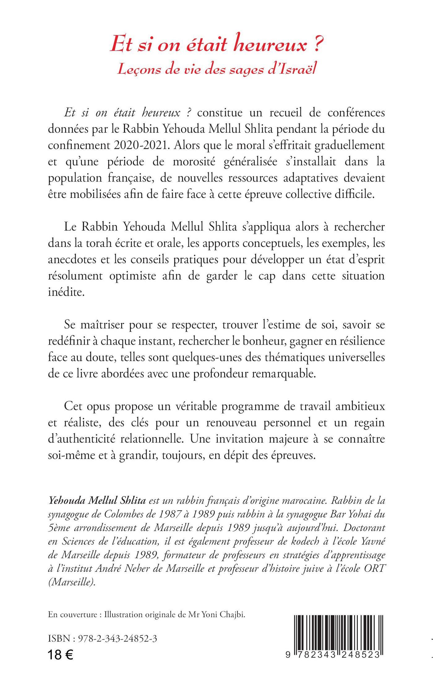 Cet ouvrage est un recueil de conférences données par le Rabbin Yehouda Mellul Shlita pendant la période du confinement 2020-2021. Alors que le moral s’effritait et qu’une période de morosité généralisée s’installait dans la population française, de nouvelles ressources adaptatives devaient être mobilisées afin de faire face à cette épreuve collective. Le Rabbin Yehouda Mellul Shlita s’appliqua alors à rechercher dans la torah écrite et orale, les apports conceptuels, les exemples, les anecdotes et les conseils pratiques pour développer un état d’esprit résolument optimiste dans cette situation inédite. Se maîtriser pour se respecter, trouver l’estime de soi, savoir se redéfinir à chaque instant, rechercher le bonheur, gagner en résilience face au doute, telles sont quelques-unes des thématiques universelles abordées. Cet opus propose un véritable programme de travail ambitieux et réaliste, des clés pour un renouveau personnel et un regain d’authenticité relationnelle. Une invitation majeure à se connaître soi-même et à grandir, toujours, en dépit des épreuves.