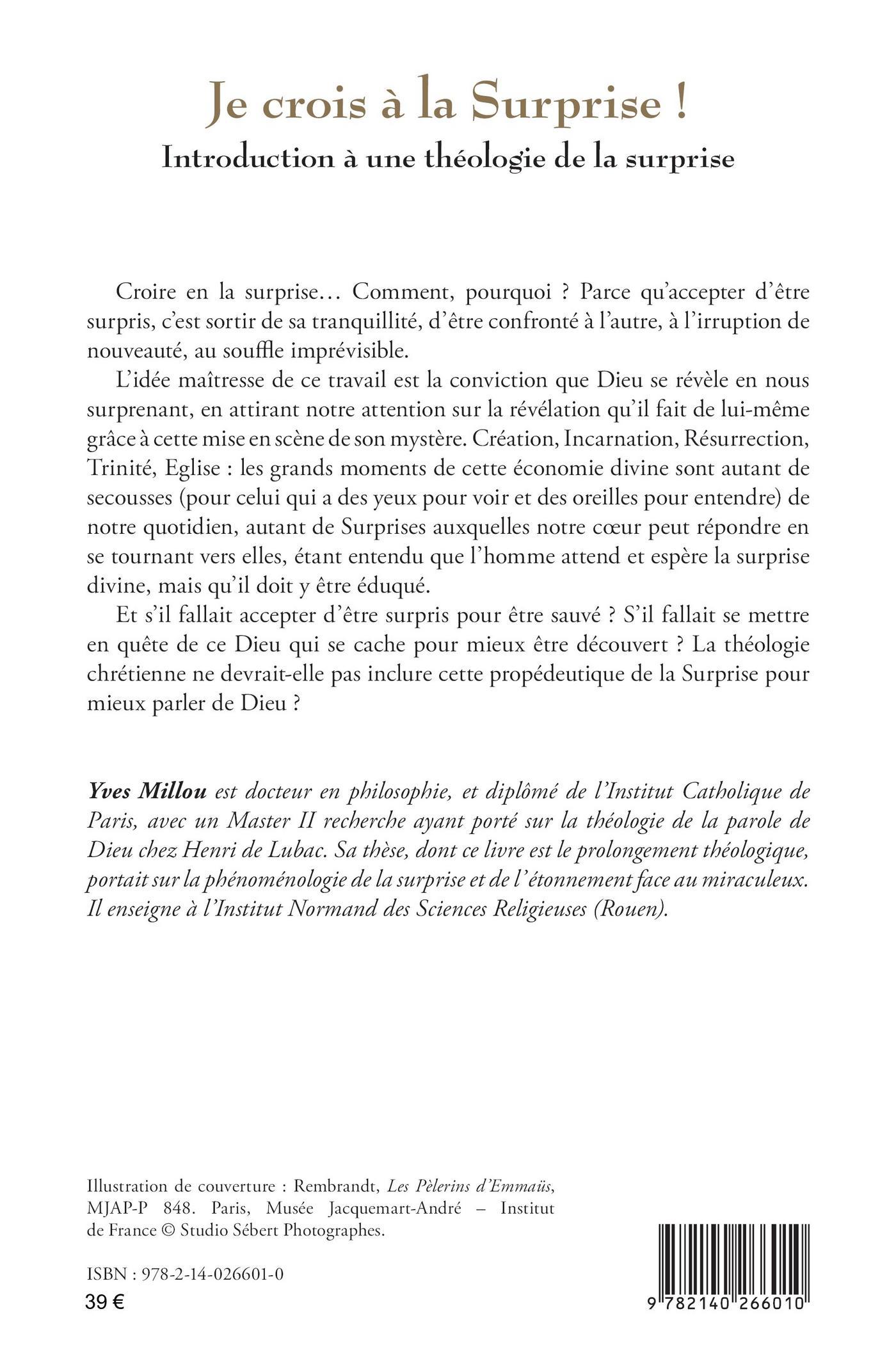Croire en la surprise : comment, pourquoi ? Parce qu’accepter d’être surpris, c’est sortir de sa tranquillité, d’être confronté à l’autre, à l’irruption de nouveauté, au souffle imprévisible. L’idée maîtresse de ce travail est la conviction que Dieu se révèle en nous surprenant, en attirant notre attention sur la révélation qu’il fait de lui-même grâce à cette mise en scène de son mystère. Création, Incarnation, Résurrection, Trinité, Eglise : les grands moments de cette économie divine sont autant de secousses de notre quotidien, autant de Surprises auxquelles notre coeur peut répondre en se tournant vers elles, étant entendu que l’homme attend et espère la surprise divine, mais qu’il doit y être éduqué. Et s’il fallait accepter d’être surpris pour être sauvé ? S’il fallait se mettre en quête de ce Dieu qui se cache pour mieux être découvert ? La théologie chrétienne ne devrait-elle pas inclure cette propédeutique de la Surprise pour mieux parler de Dieu ?