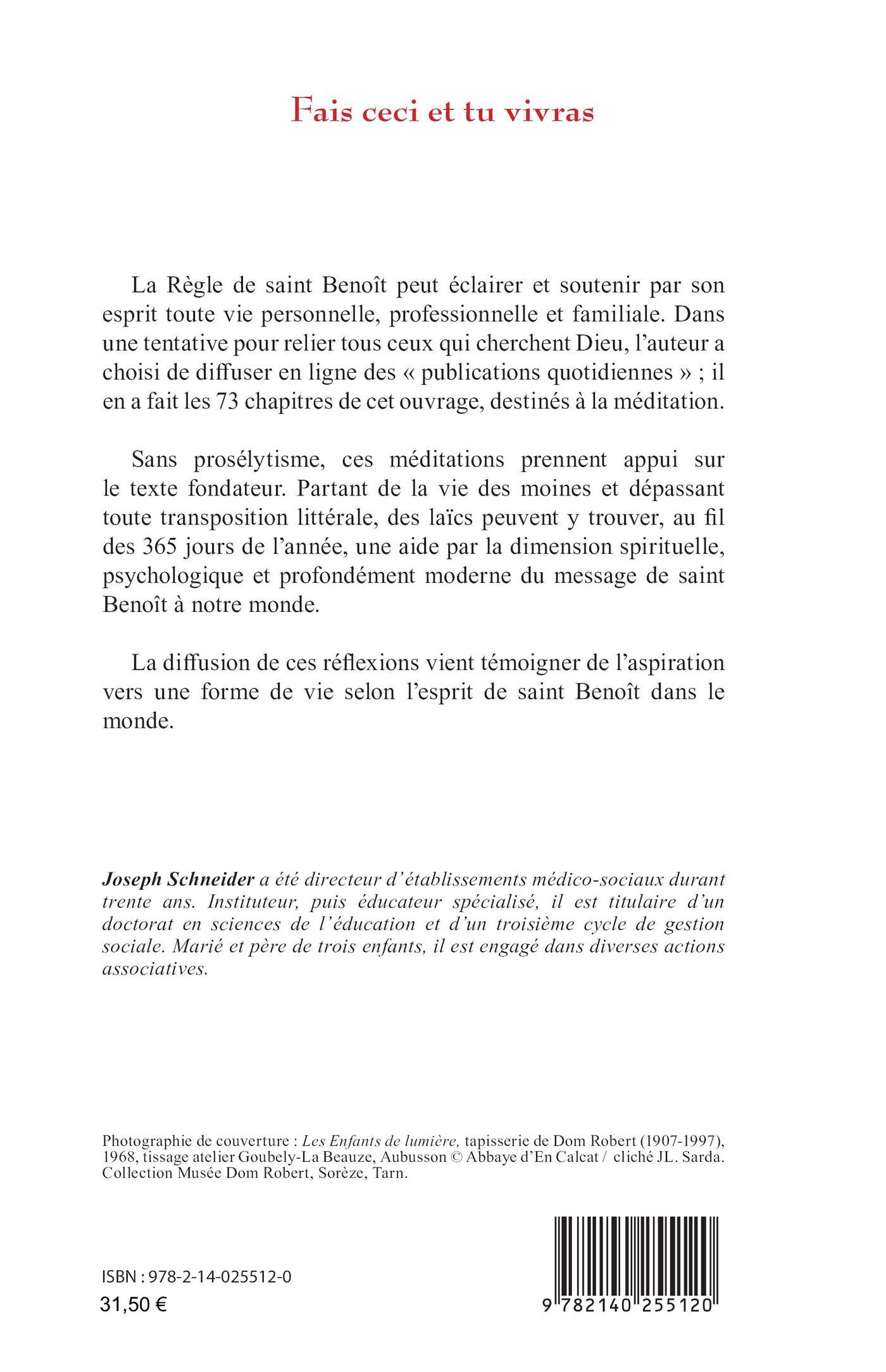 La Règle de saint Benoît peut éclairer et soutenir par son esprit toute vie personnelle, professionnelle et familiale. Dans une tentative pour relier tous ceux qui cherchent Dieu, l’auteur a choisi de diffuser en ligne des « publications quotidiennes » ; il en a fait les 73 chapitres de cet ouvrage, destinés à la méditation. Sans prosélytisme, ces méditations prennent appui sur le texte fondateur. Partant de la vie des moines et dépassant toute transposition littérale, des laïcs peuvent y trouver, au fil des 365 jours de l’année, une aide par la dimension spirituelle, psychologique et profondément moderne du message de saint Benoît à notre monde. La diffusion de ces réflexions vient témoigner de l’aspiration vers une forme de vie selon l’esprit de saint Benoît dans le monde.